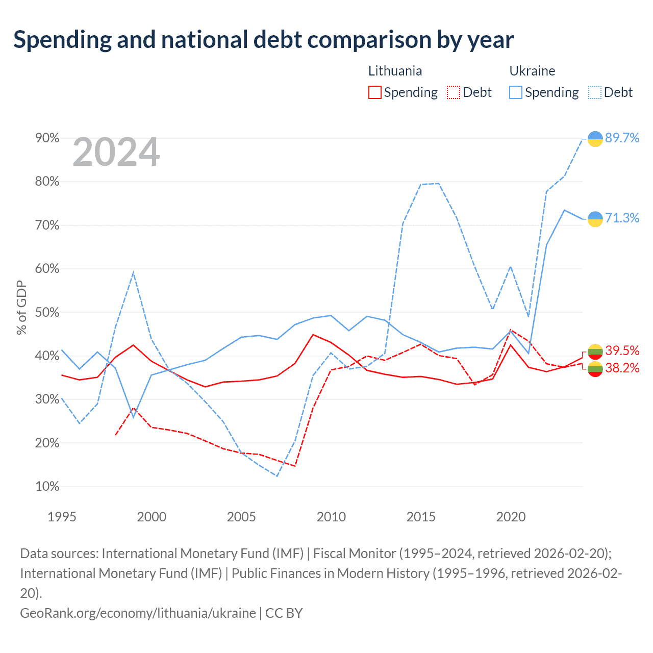 Lithuania has $32.4B in government debt (38.2% of GDP), compared to $171B (89.7% of GDP) in Ukraine.