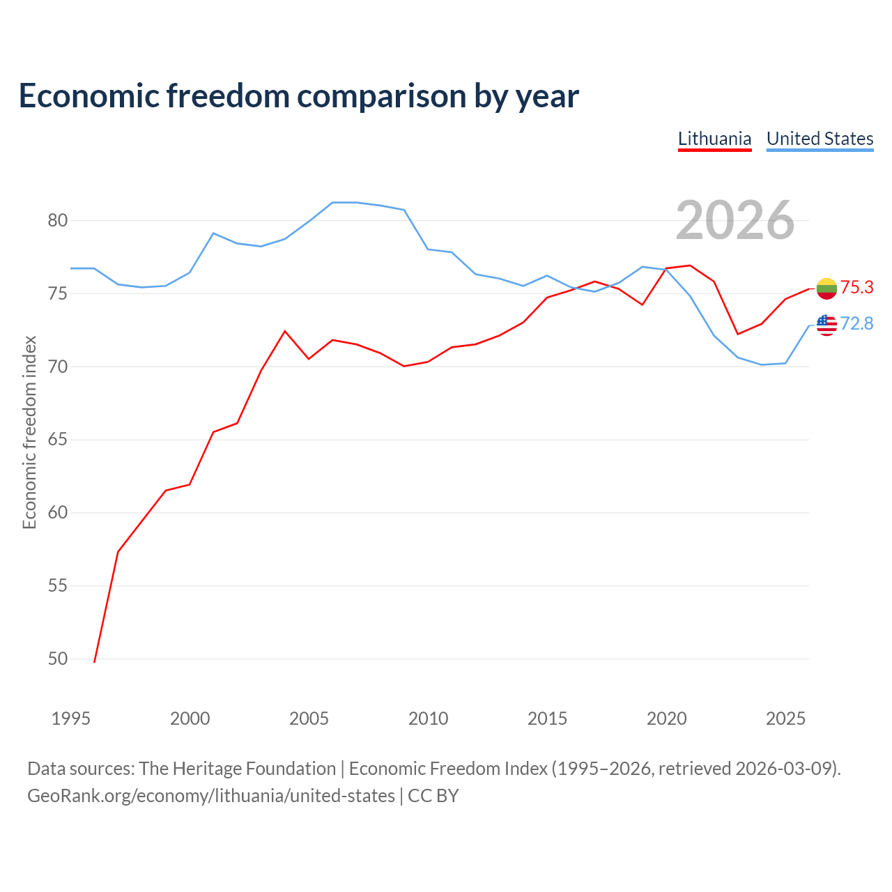 Data sources: The Heritage Foundation | Economic Freedom Index (1995–2026, retrieved 2026-03-09).