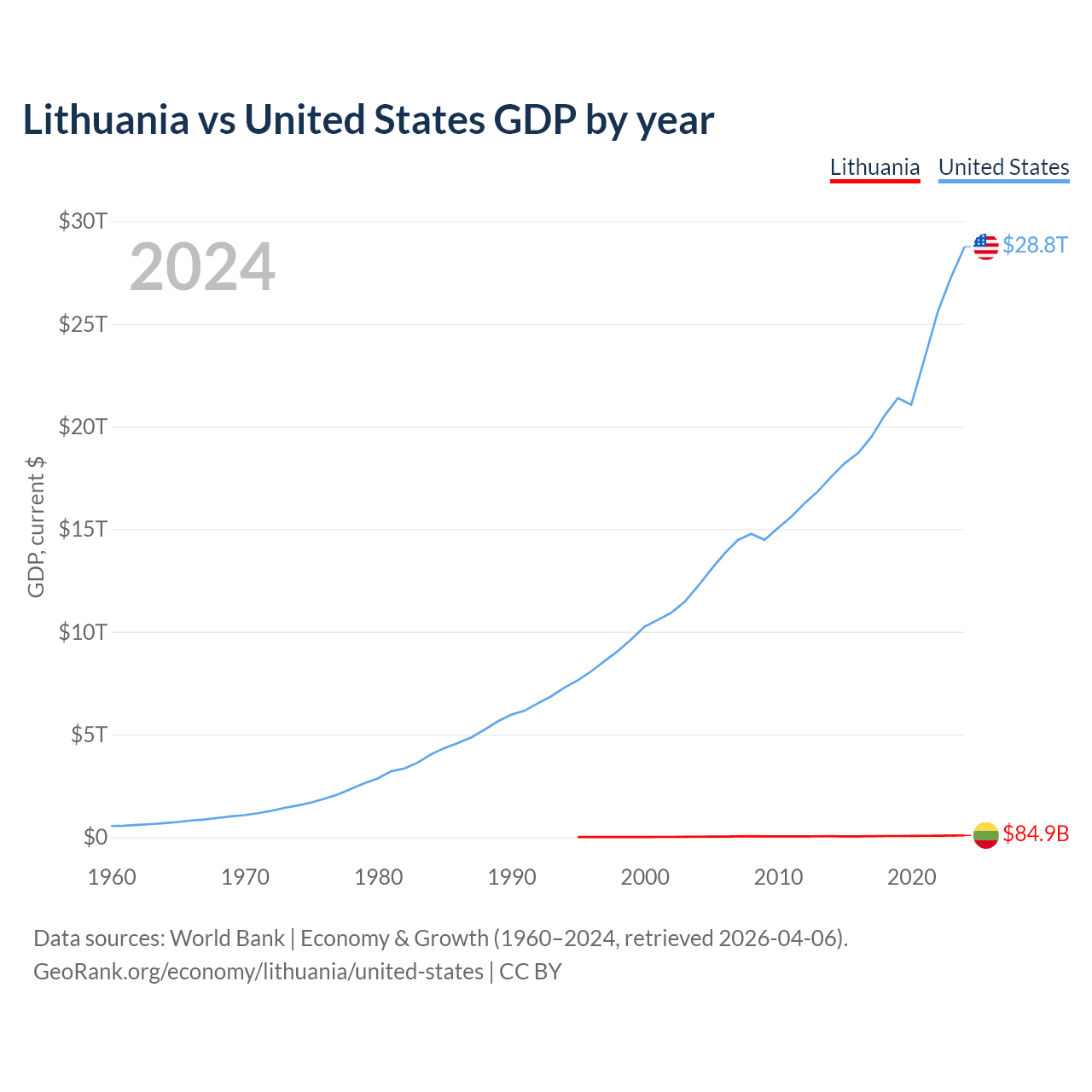 Lithuania has a GDP of $84.9B compared to $28.8T for the United States, ranking 79/197 and 1/197 by economy size, respectively.