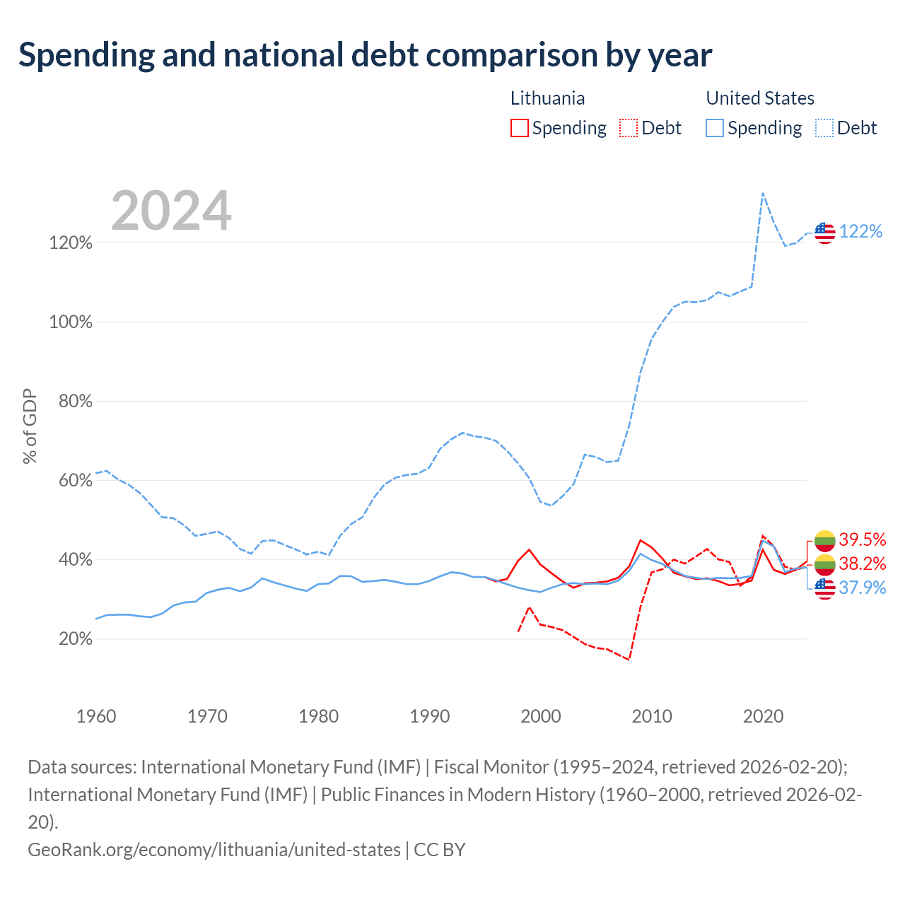 Lithuania has $32.4B in government debt (38.2% of GDP), compared to $35.2T (122.3% of GDP) in the United States.