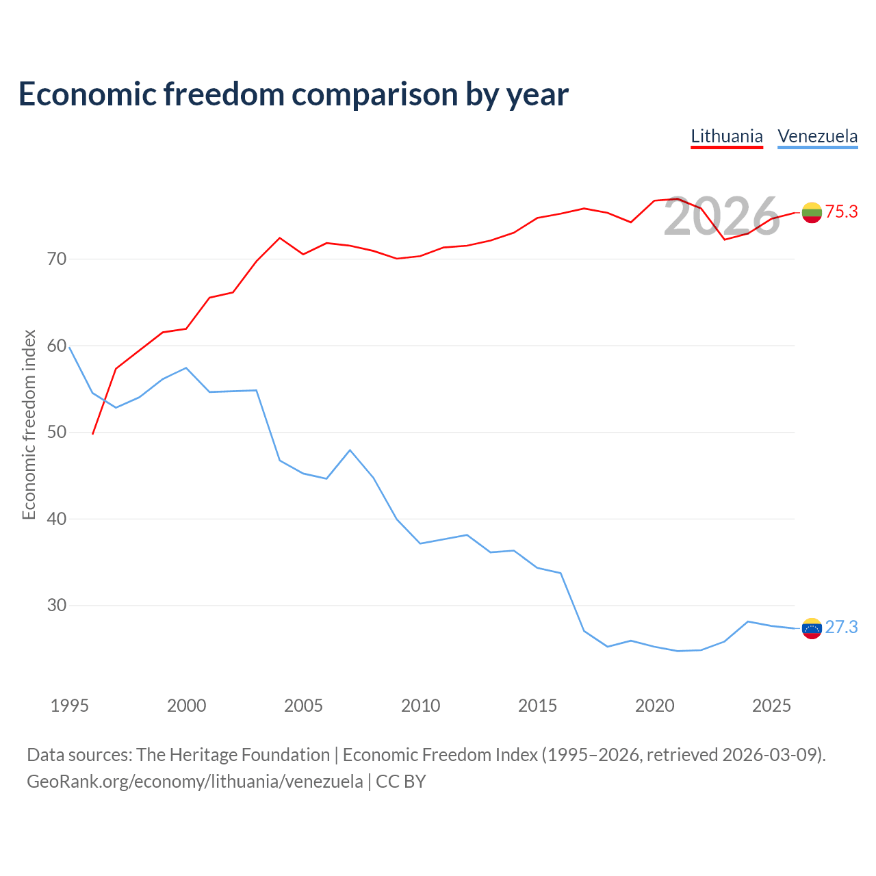 The Economic Freedom Index for Lithuania is 75.3, ranking 18/197, compared to 27.3 for Venezuela, ranking 194/197. The chart above displays a comparison of annual changes in economic freedom indexes.