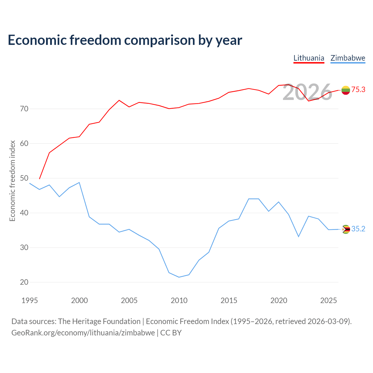 The Economic Freedom Index for Lithuania is 75.3, ranking 18/197, compared to 35.2 for Zimbabwe, ranking 190/197. The chart above displays a comparison of annual changes in economic freedom indexes.
