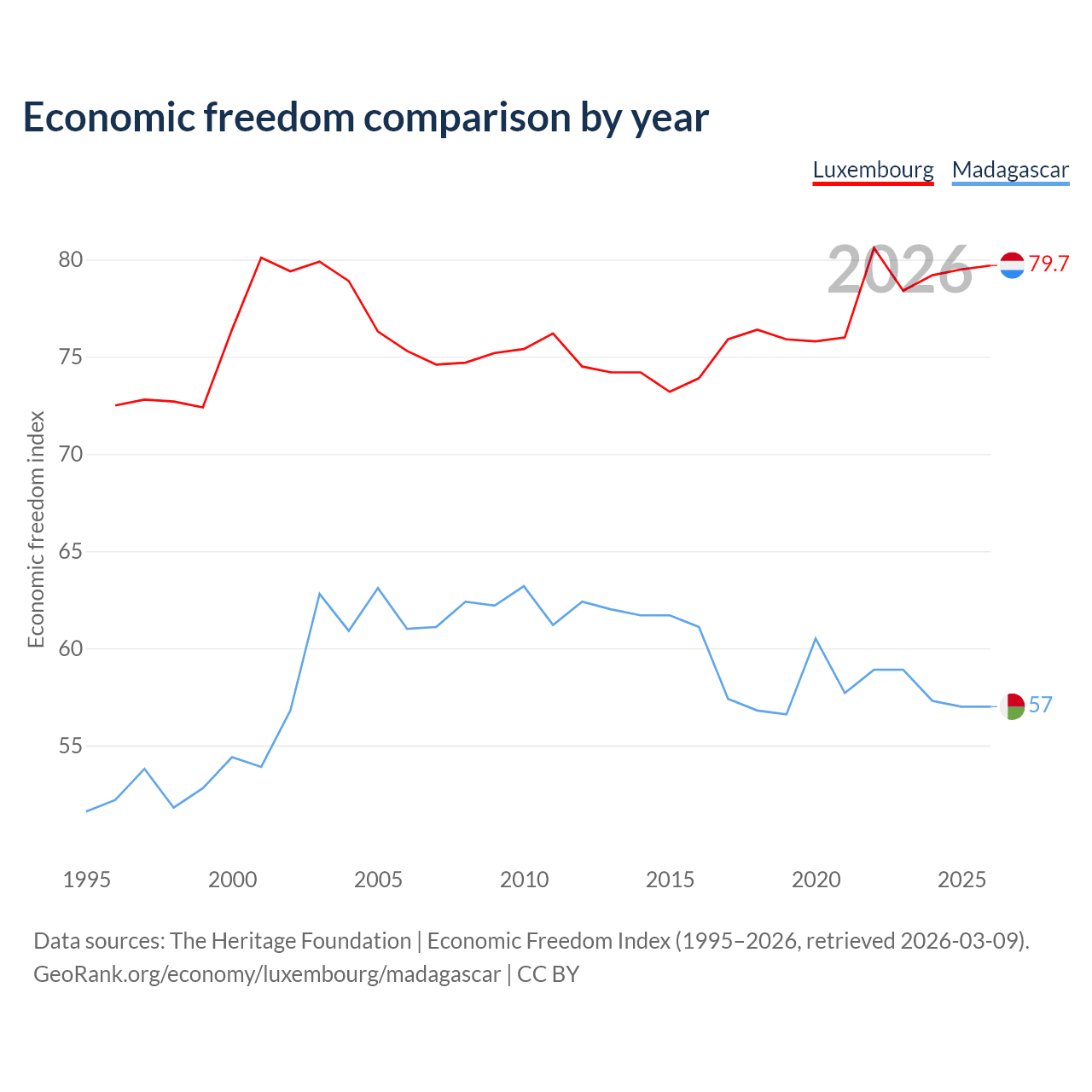 The Economic Freedom Index for Luxembourg is 79.7, ranking 7/197, compared to 57 for Madagascar, ranking 119/197. The chart above displays a comparison of annual changes in economic freedom indexes.