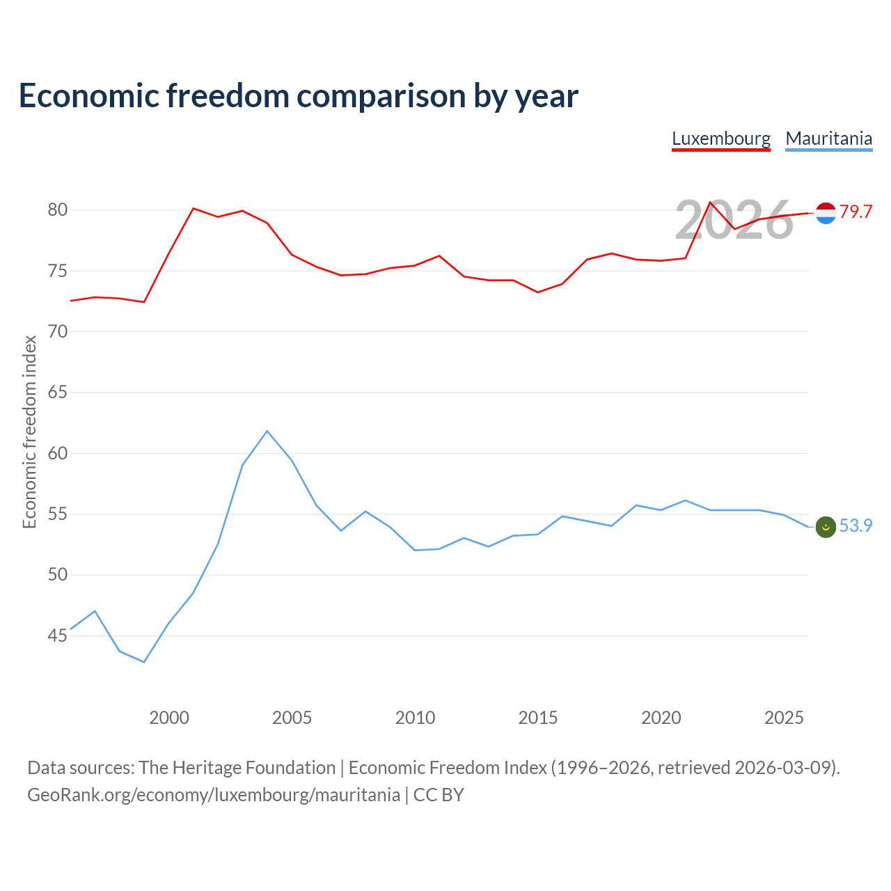 The Economic Freedom Index for Luxembourg is 79.7, ranking 7/197, compared to 53.9 for Mauritania, ranking 136/197. The chart above displays a comparison of annual changes in economic freedom indexes.