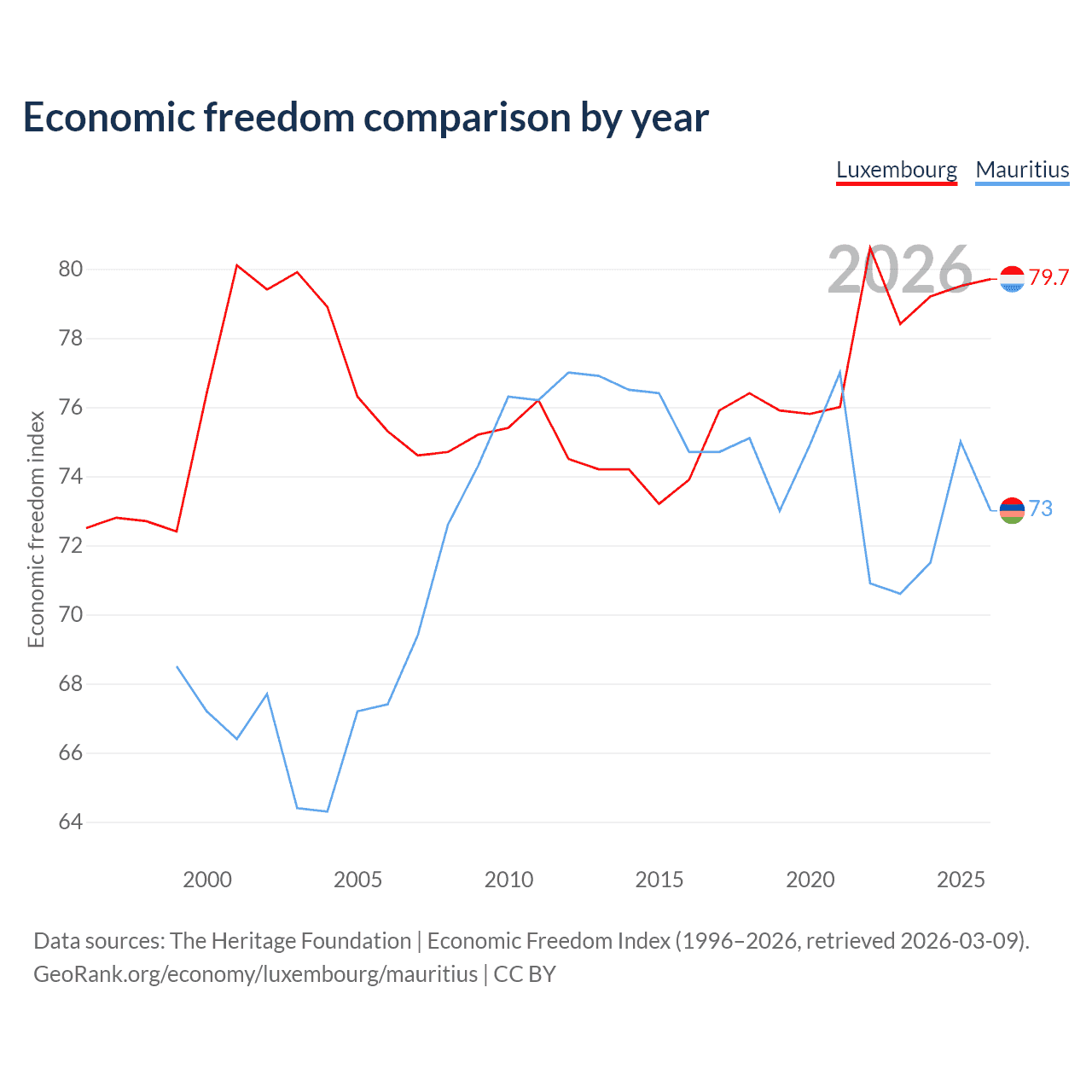 The Economic Freedom Index for Luxembourg is 79.7, ranking 7/197, compared to 73 for Mauritius, ranking 26/197. The chart above displays a comparison of annual changes in economic freedom indexes.