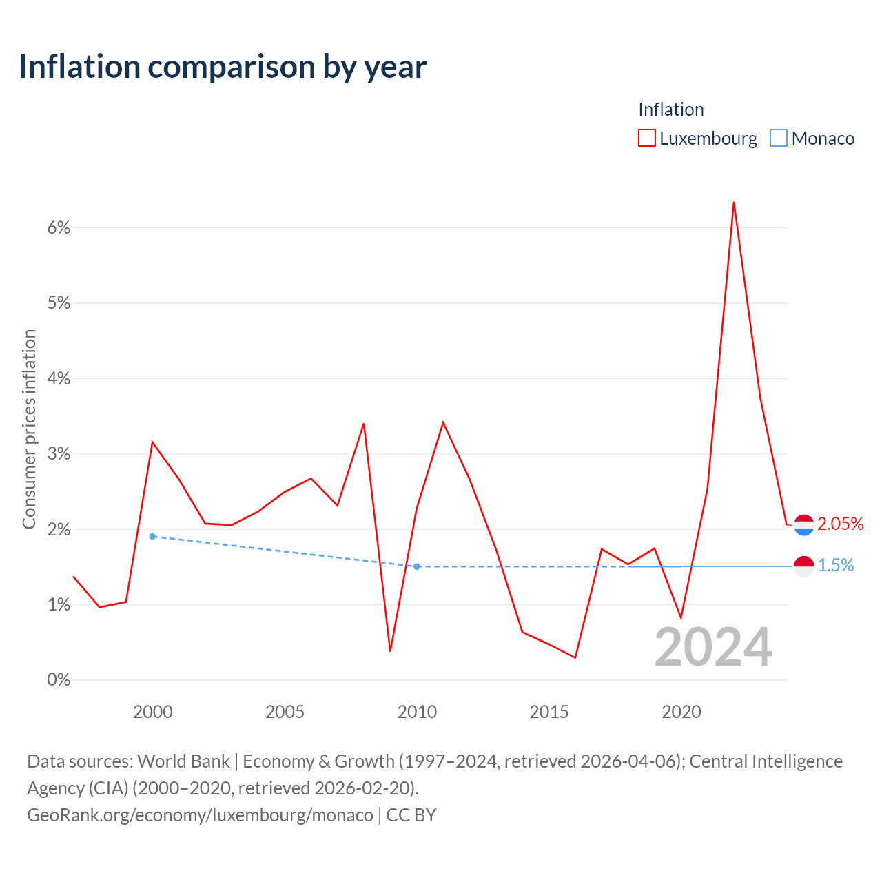 Over the past 21 years, Luxembourg has recorded an average annual inflation rate of 1.94%, compared with 1.58% in Monaco. In 2020, inflation was 2.05% in Luxembourg and 1.5% in Monaco.