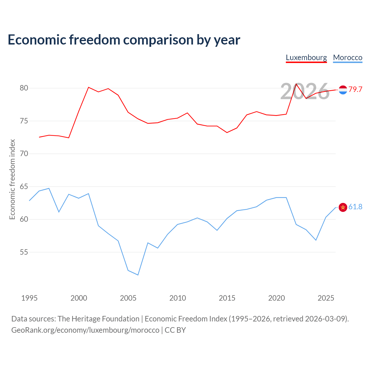 The Economic Freedom Index for Luxembourg is 79.7, ranking 7/197, compared to 61.8 for Morocco, ranking 91/197. The chart above displays a comparison of annual changes in economic freedom indexes.