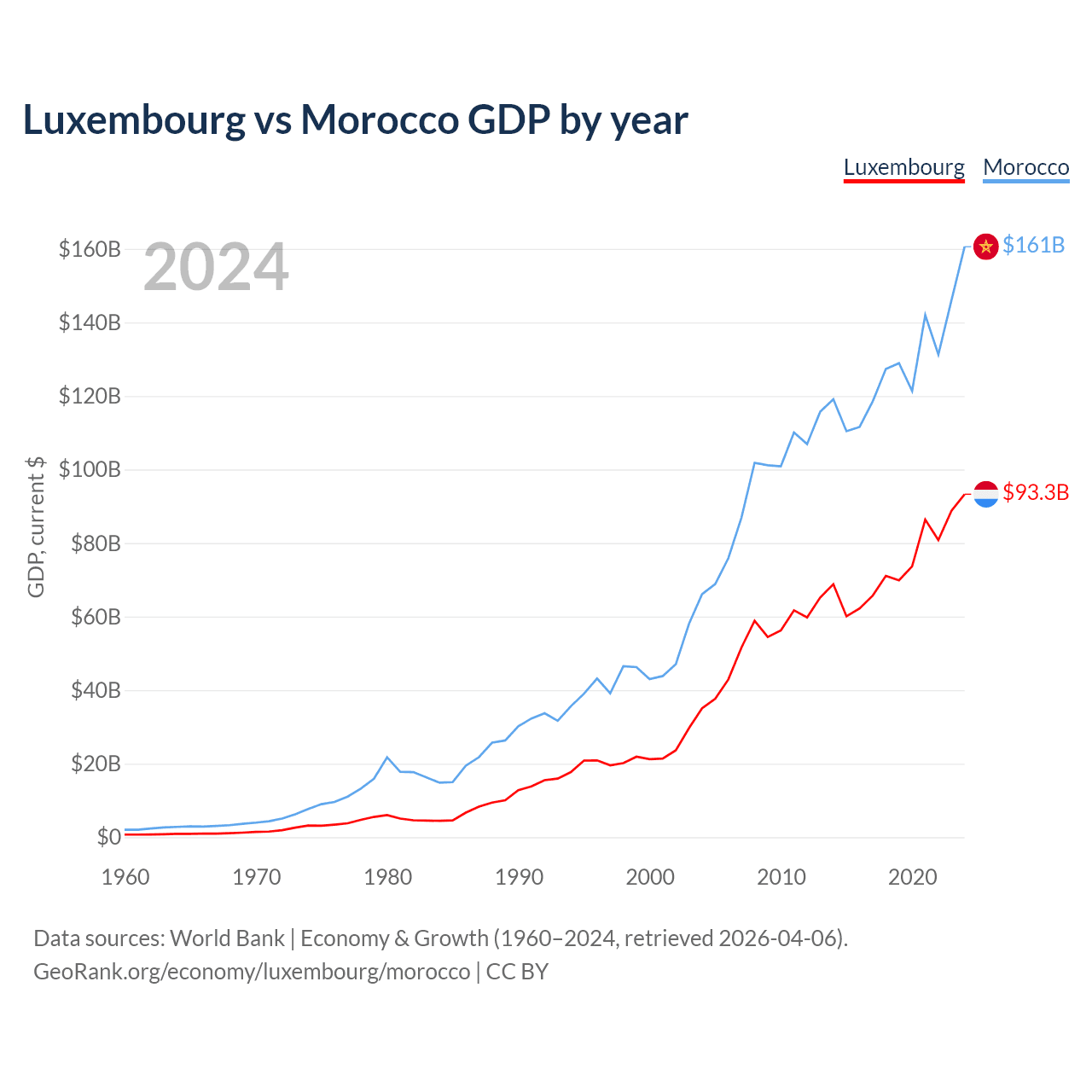 Luxembourg has a GDP of $93.3B compared to $161B for Morocco, ranking 74/197 and 58/197 by economy size, respectively.