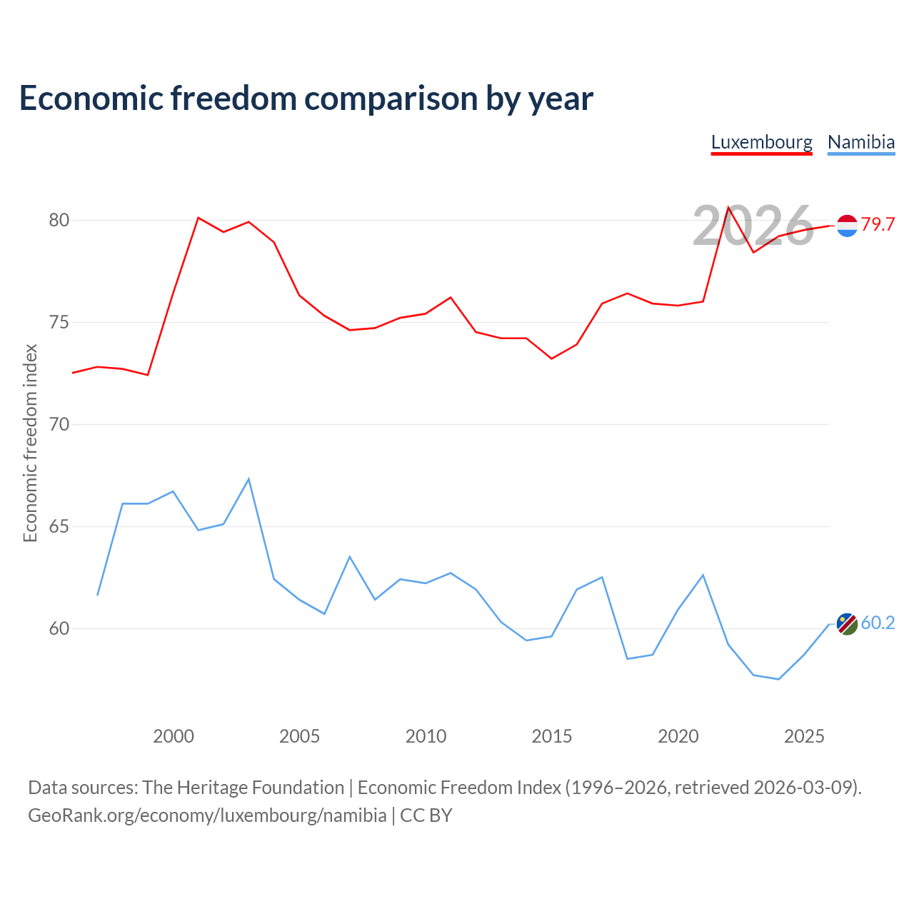 The Economic Freedom Index for Luxembourg is 79.7, ranking 7/197, compared to 60.2 for Namibia, ranking 95/197. The chart above displays a comparison of annual changes in economic freedom indexes.