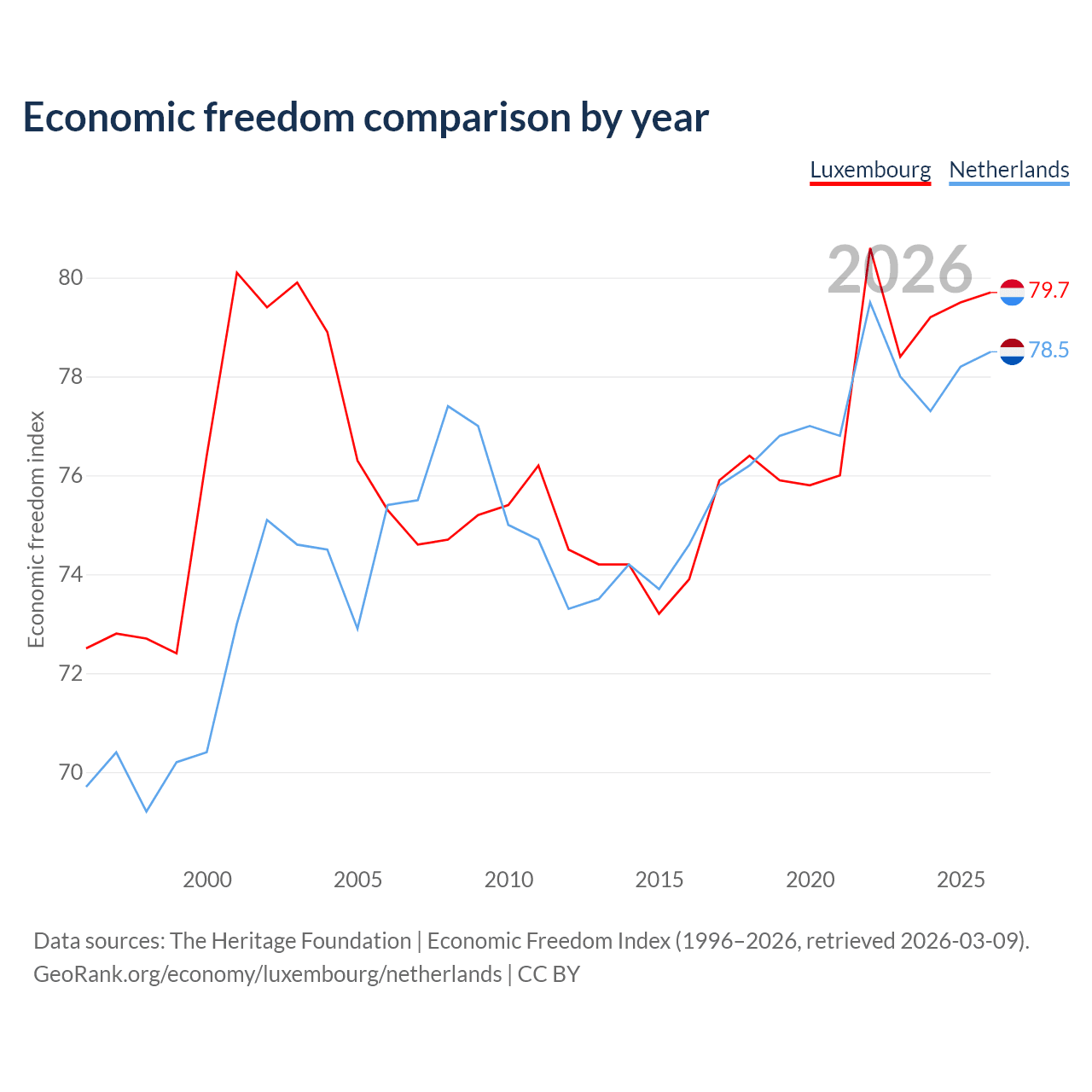 The Economic Freedom Index for Luxembourg is 79.7, ranking 7/197, compared to 78.5 for the Netherlands, ranking 11/197. The chart above displays a comparison of annual changes in economic freedom indexes.