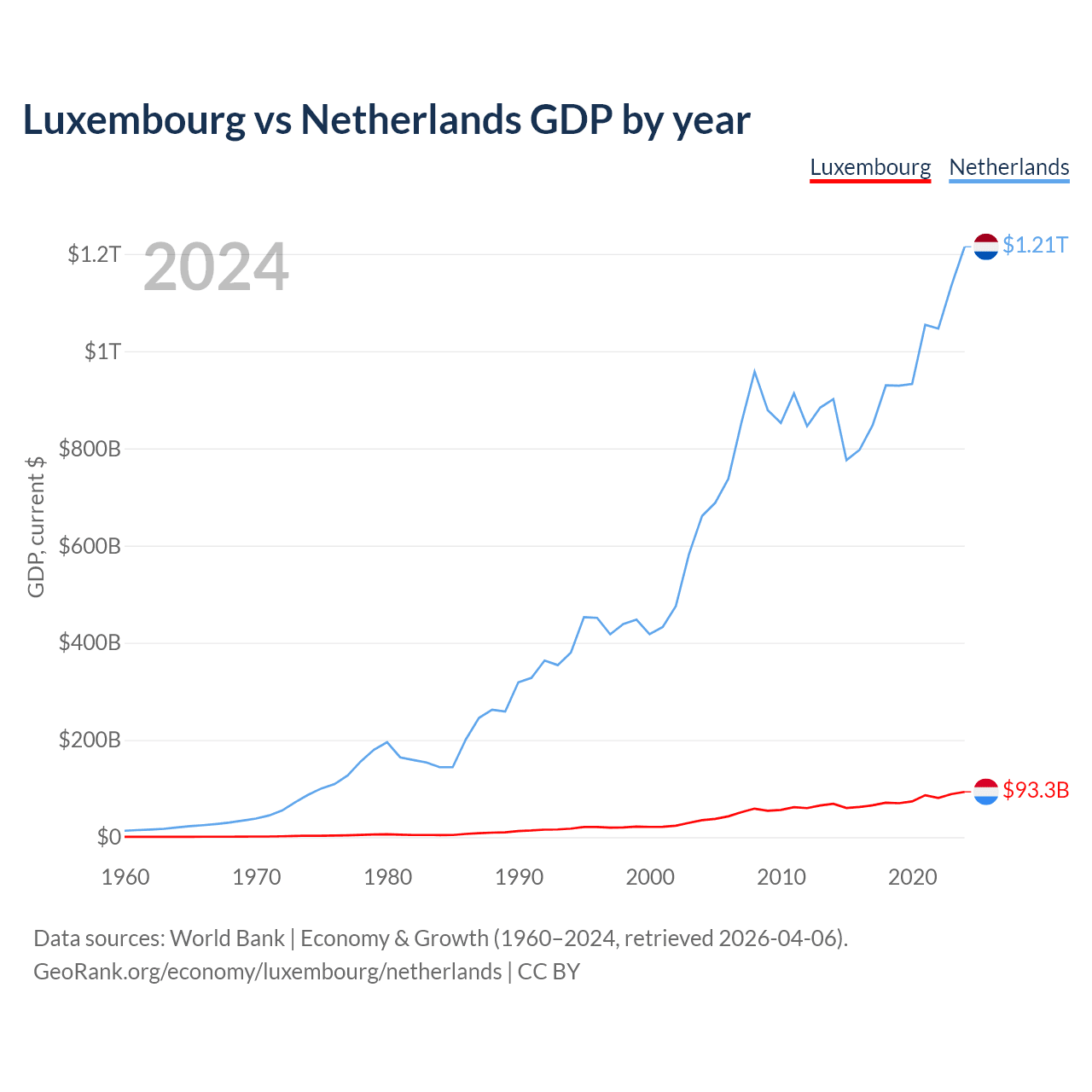 Luxembourg has a GDP of $93.3B compared to $1.21T for the Netherlands, ranking 74/197 and 19/197 by economy size, respectively.