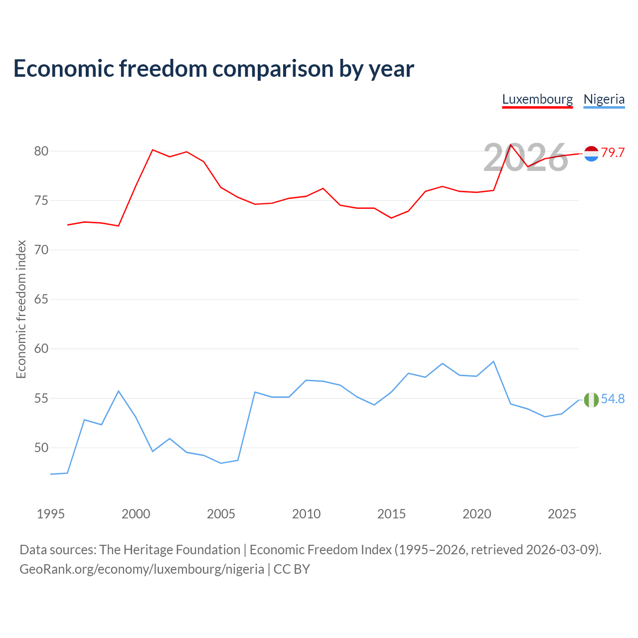 The Economic Freedom Index for Luxembourg is 79.7, ranking 7/197, compared to 54.8 for Nigeria, ranking 132/197. The chart above displays a comparison of annual changes in economic freedom indexes.