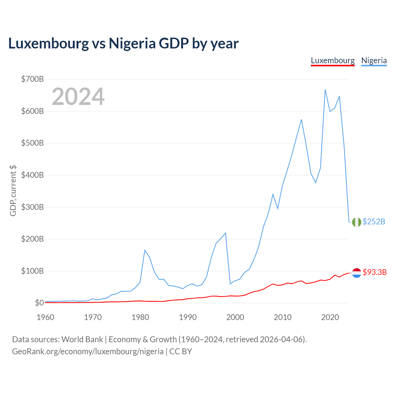 Luxembourg has a GDP of $93.3B compared to $252B for Nigeria, ranking 74/197 and 54/197 by economy size, respectively.
