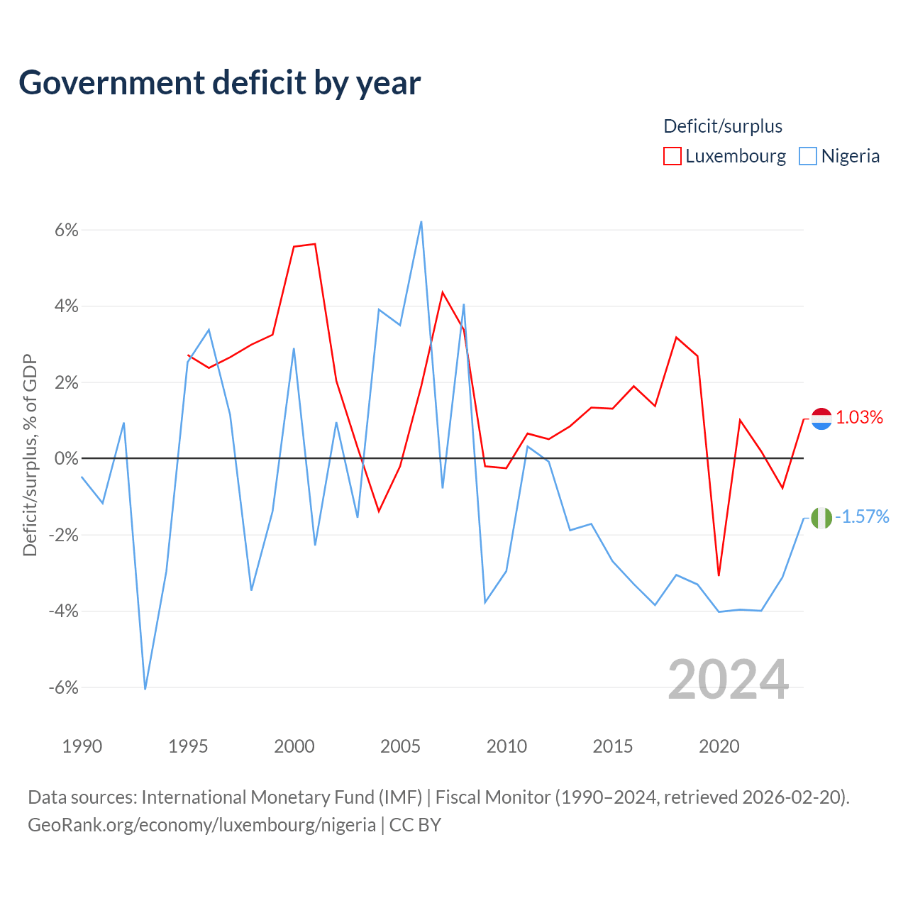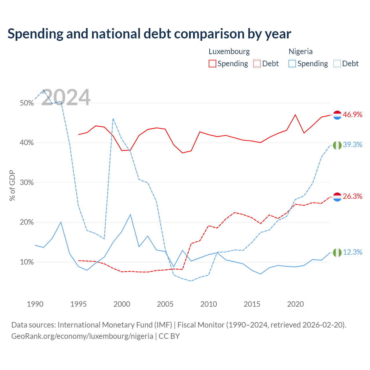 Luxembourg has $24.5B in government debt (26.3% of GDP), compared to $99.2B (39.3% of GDP) in Nigeria.