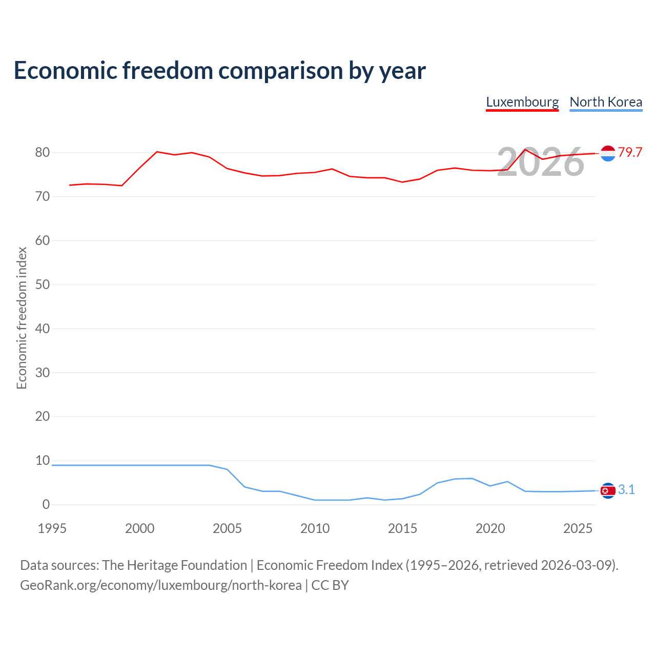 The Economic Freedom Index for Luxembourg is 79.7, ranking 7/197, compared to 3.1 for North Korea, ranking 197/197. The chart above displays a comparison of annual changes in economic freedom indexes.