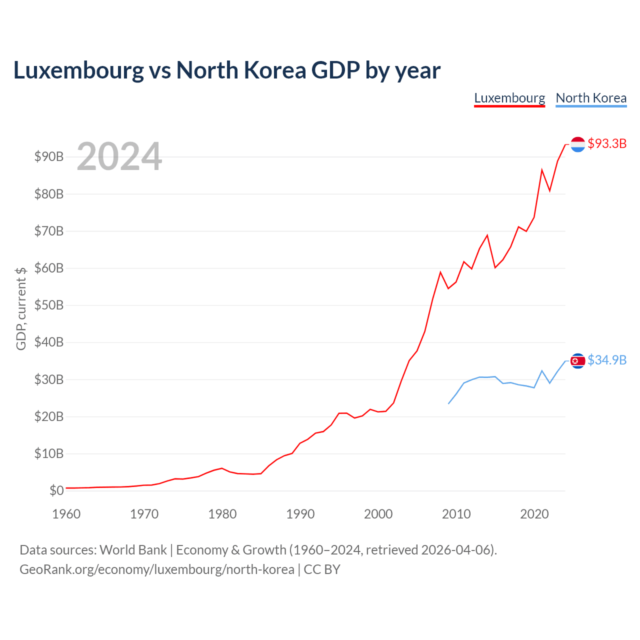 Luxembourg has a GDP of $93.3B compared to $34.9B for North Korea, ranking 74/197 and 106/197 by economy size, respectively.