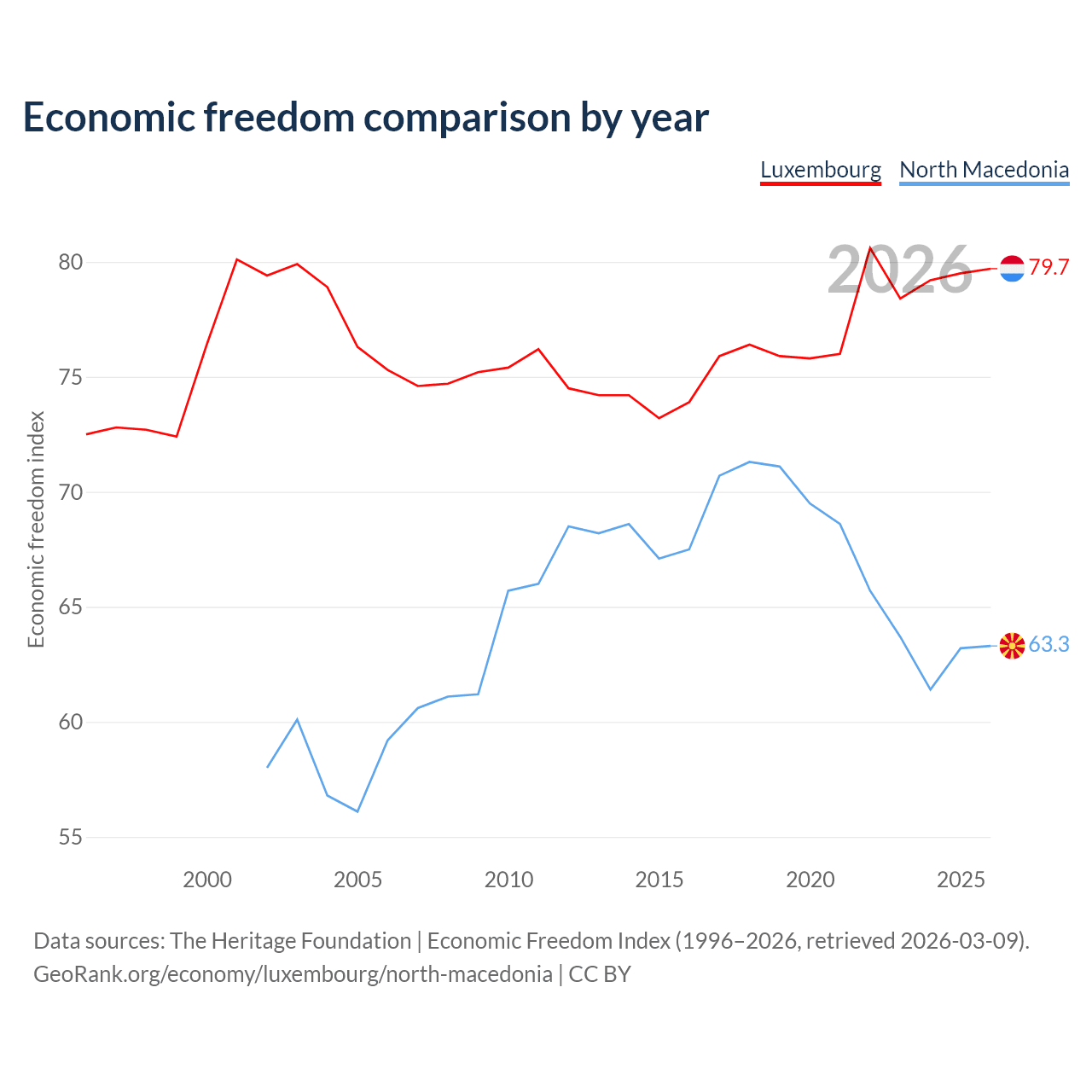 The Economic Freedom Index for Luxembourg is 79.7, ranking 7/197, compared to 63.3 for North Macedonia, ranking 81/197. The chart above displays a comparison of annual changes in economic freedom indexes.