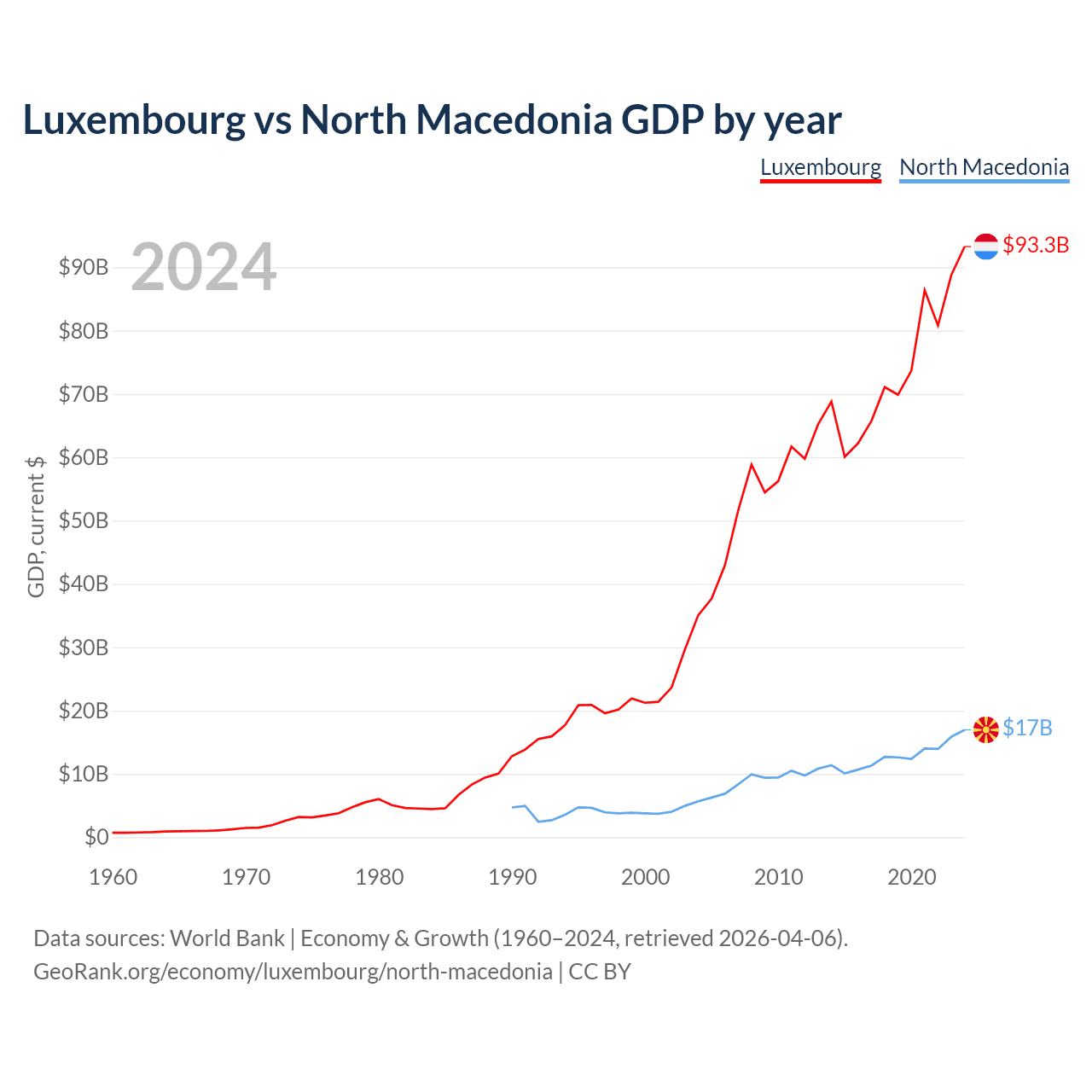 Luxembourg has a GDP of $93.3B compared to $17B for North Macedonia, ranking 74/197 and 138/197 by economy size, respectively.