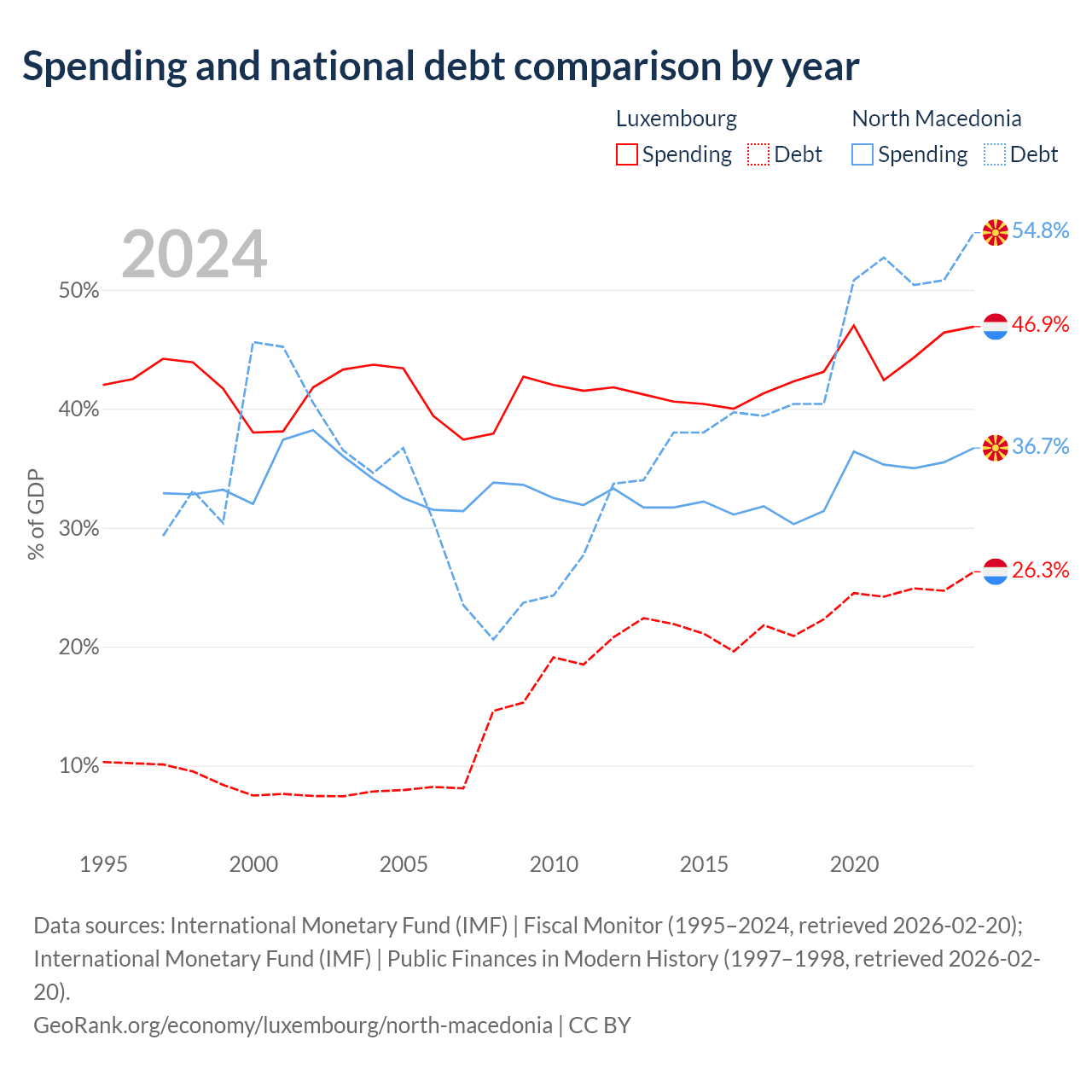 Luxembourg has $24.5B in government debt (26.3% of GDP), compared to $9.3B (54.8% of GDP) in North Macedonia.