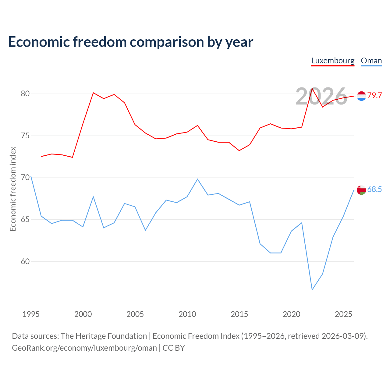 The Economic Freedom Index for Luxembourg is 79.7, ranking 7/197, compared to 68.5 for Oman, ranking 45/197. The chart above displays a comparison of annual changes in economic freedom indexes.