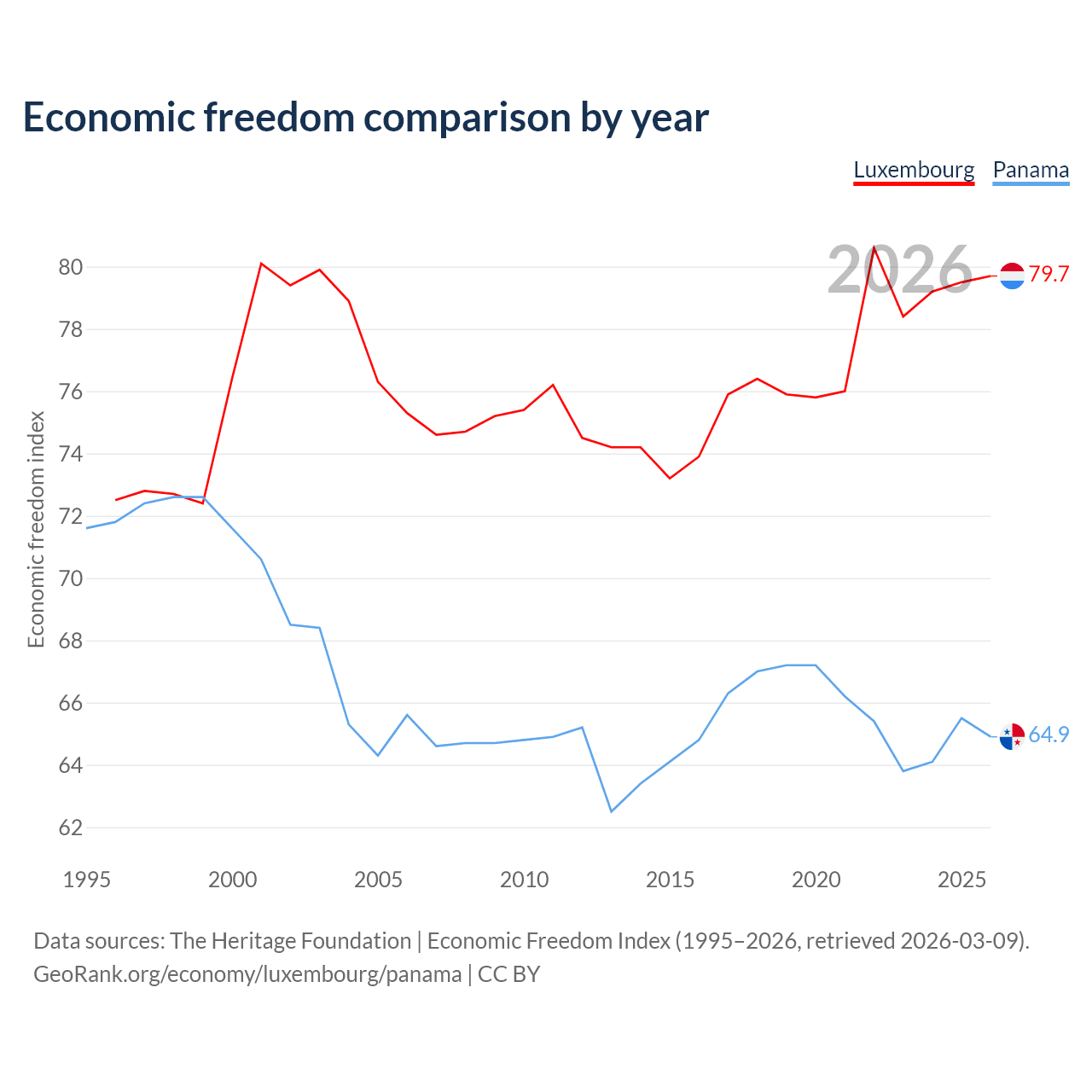 The Economic Freedom Index for Luxembourg is 79.7, ranking 7/197, compared to 64.9 for Panama, ranking 70/197. The chart above displays a comparison of annual changes in economic freedom indexes.