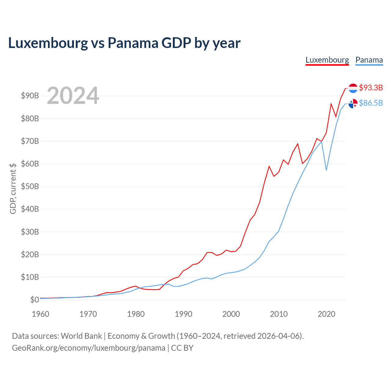 Luxembourg has a GDP of $93.3B compared to $86.5B for Panama, ranking 74/197 and 78/197 by economy size, respectively.