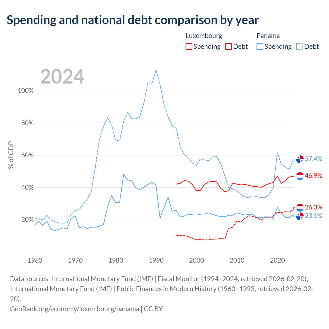 Luxembourg has $24.5B in government debt (26.3% of GDP), compared to $49.6B (57.4% of GDP) in Panama.