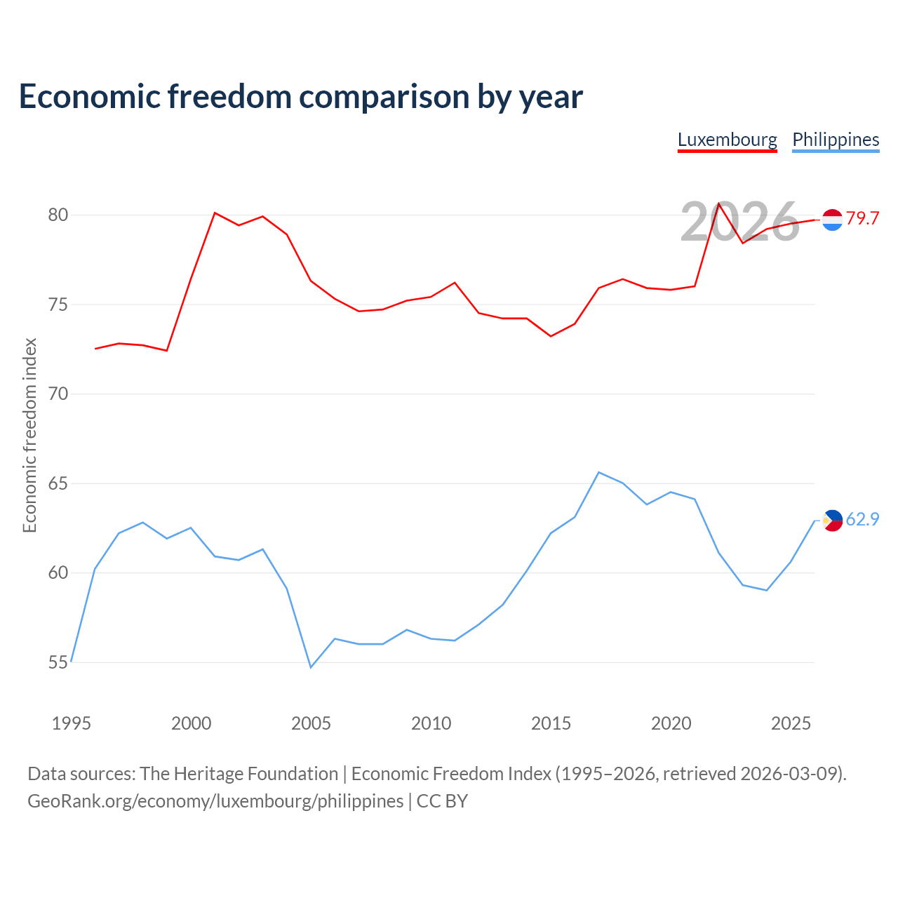 The Economic Freedom Index for Luxembourg is 79.7, ranking 7/197, compared to 62.9 for the Philippines, ranking 85/197. The chart above displays a comparison of annual changes in economic freedom indexes.