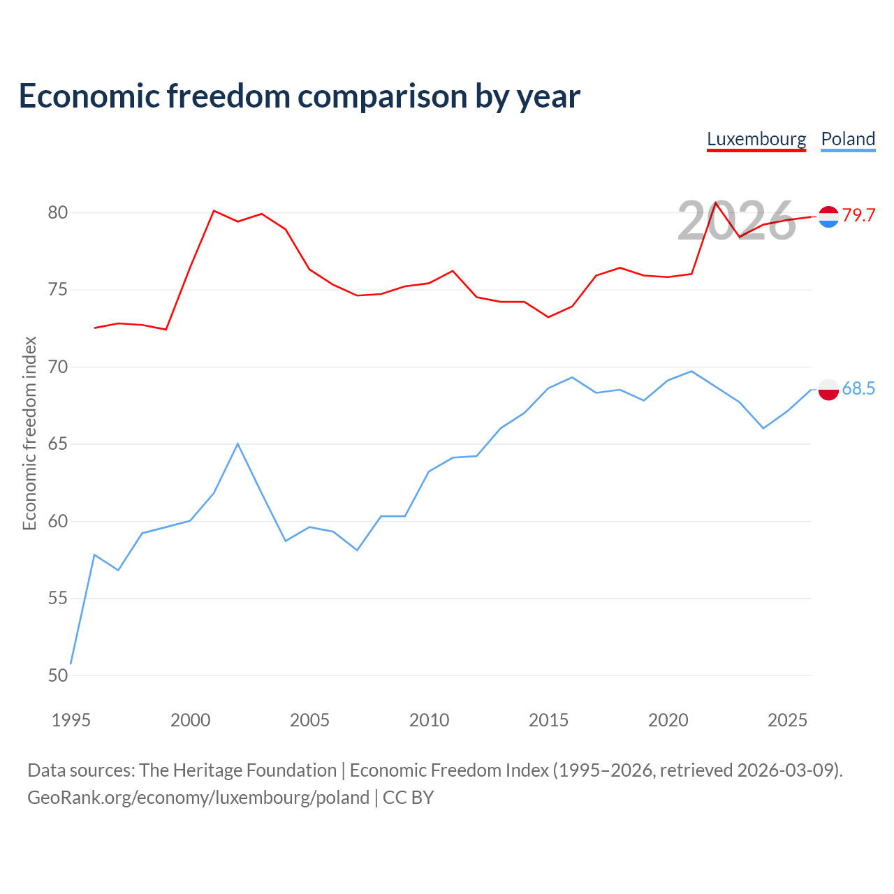The Economic Freedom Index for Luxembourg is 79.7, ranking 7/197, compared to 68.5 for Poland, ranking 46/197. The chart above displays a comparison of annual changes in economic freedom indexes.