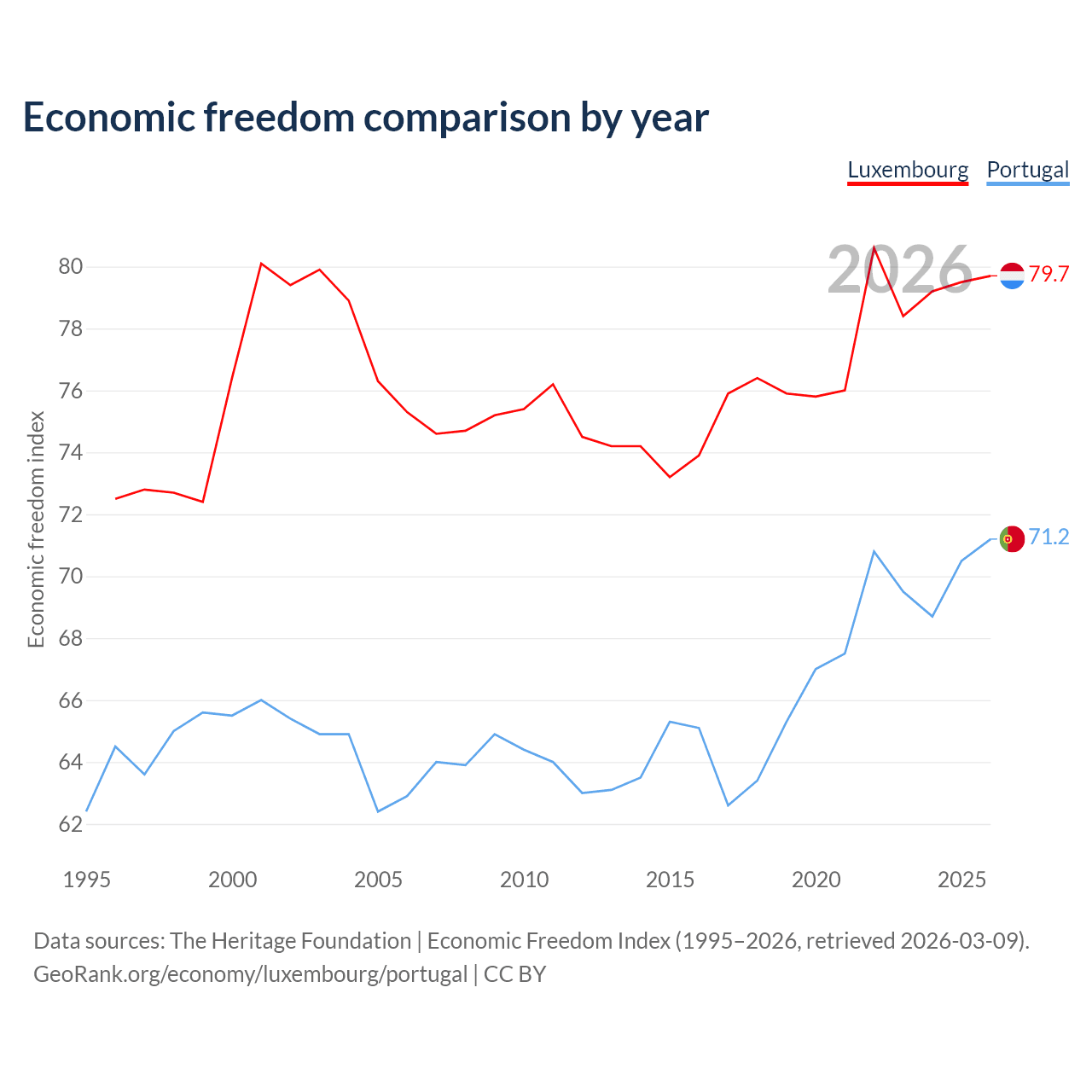 The Economic Freedom Index for Luxembourg is 79.7, ranking 7/197, compared to 71.2 for Portugal, ranking 33/197. The chart above displays a comparison of annual changes in economic freedom indexes.