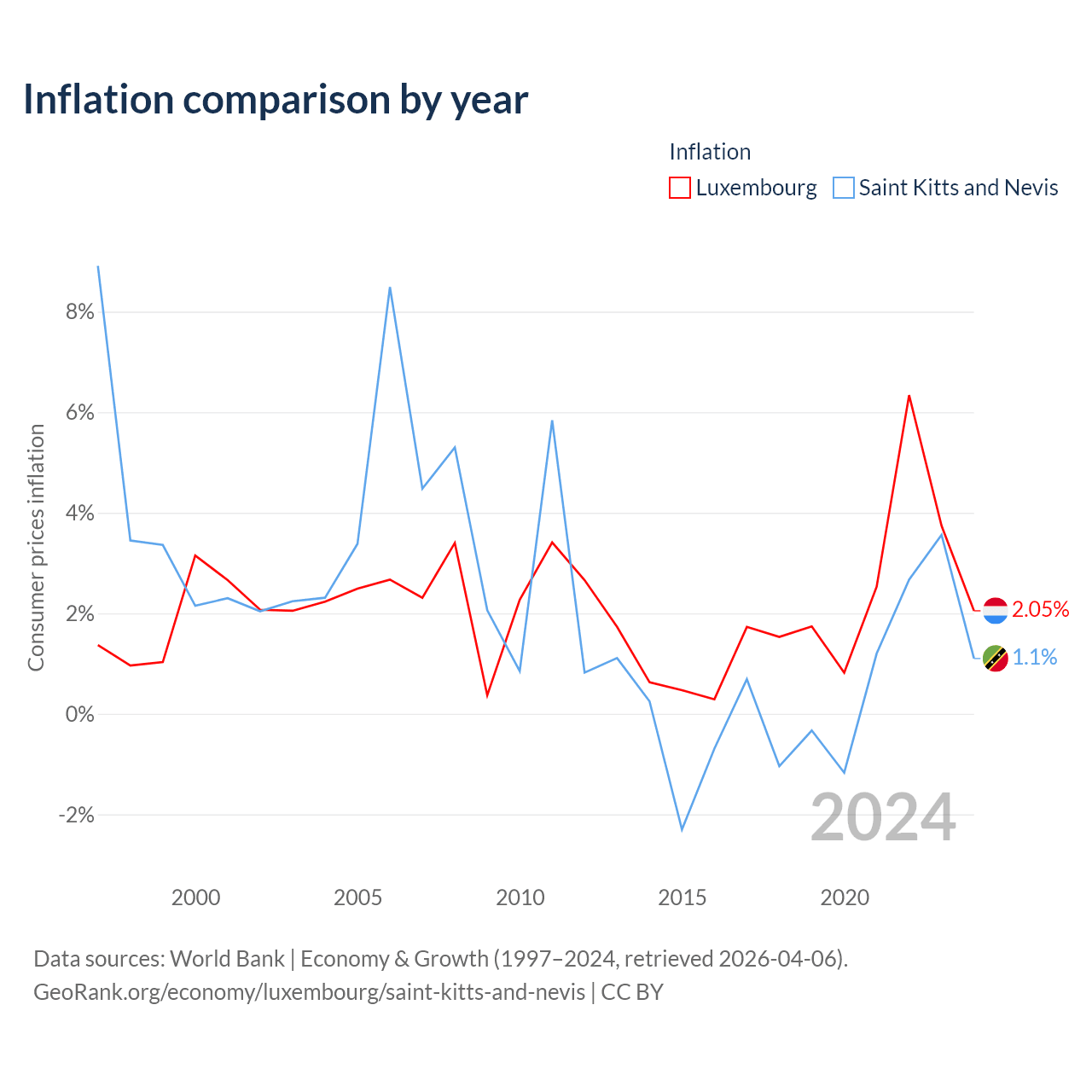 Over the past 28 years, Luxembourg has recorded an average annual inflation rate of 2.1%, compared with 2.25% in Saint Kitts and Nevis. In 2024, inflation was 2.05% in Luxembourg and 1.1% in Saint Kitts and Nevis.