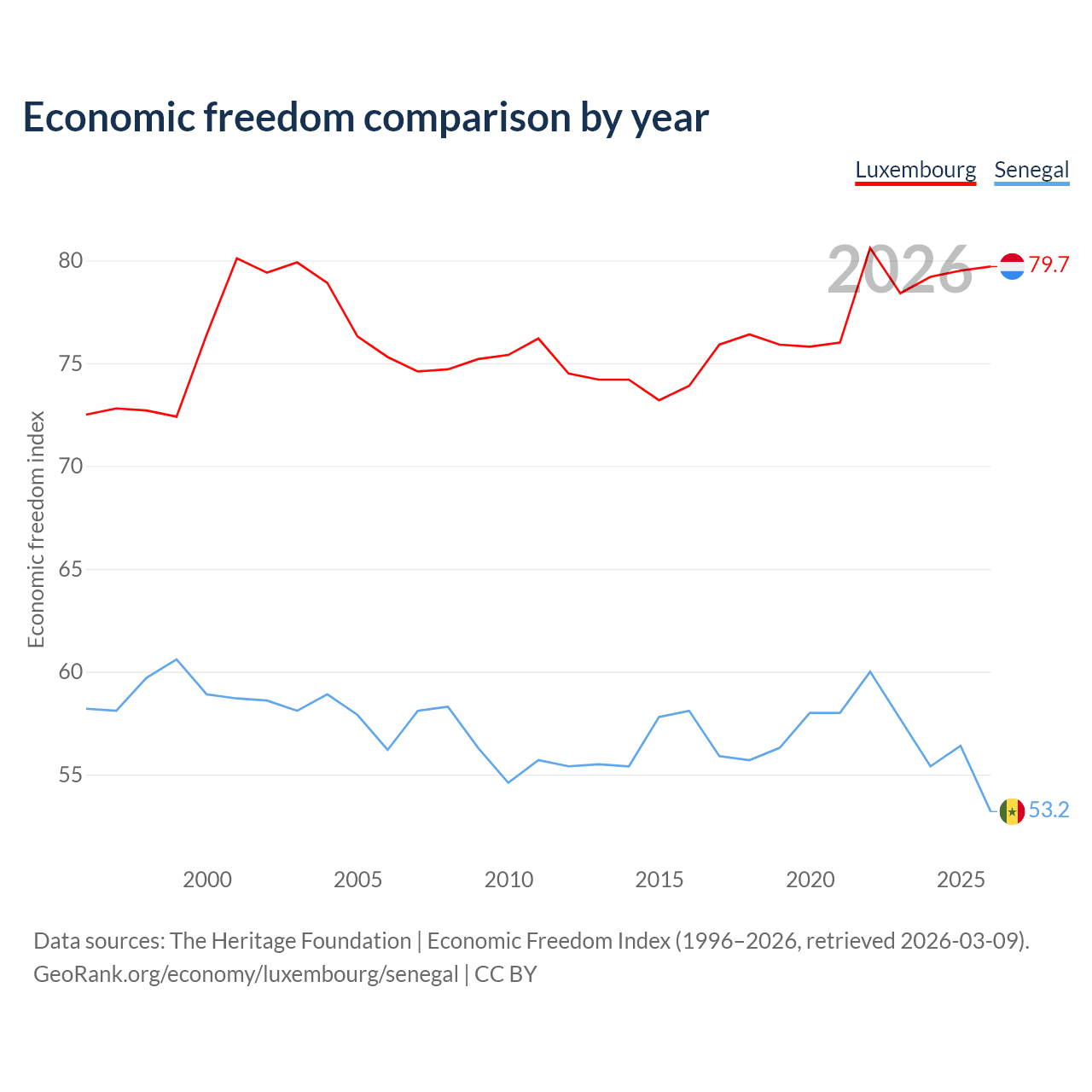 The Economic Freedom Index for Luxembourg is 79.7, ranking 7/197, compared to 53.2 for Senegal, ranking 140/197. The chart above displays a comparison of annual changes in economic freedom indexes.
