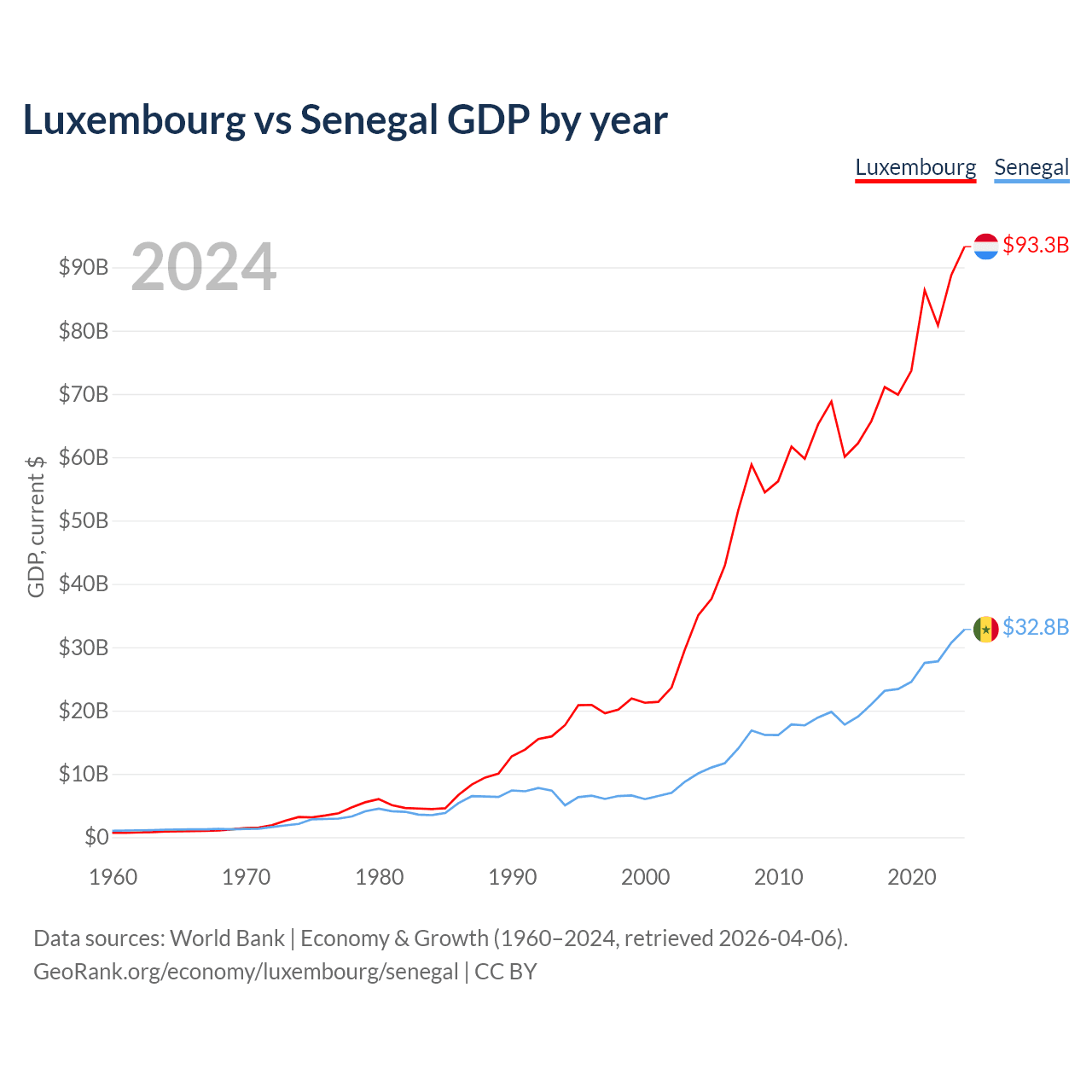 Luxembourg has a GDP of $93.3B compared to $32.8B for Senegal, ranking 74/197 and 109/197 by economy size, respectively.