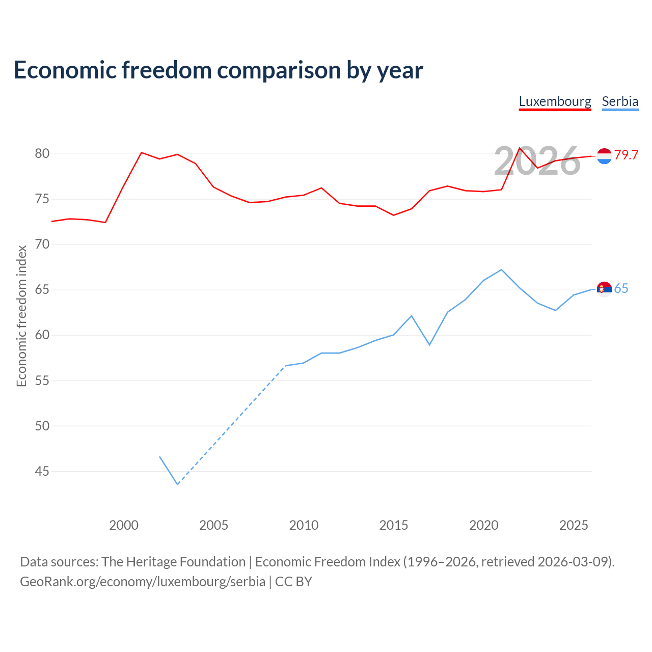 The Economic Freedom Index for Luxembourg is 79.7, ranking 7/197, compared to 65 for Serbia, ranking 68/197. The chart above displays a comparison of annual changes in economic freedom indexes.