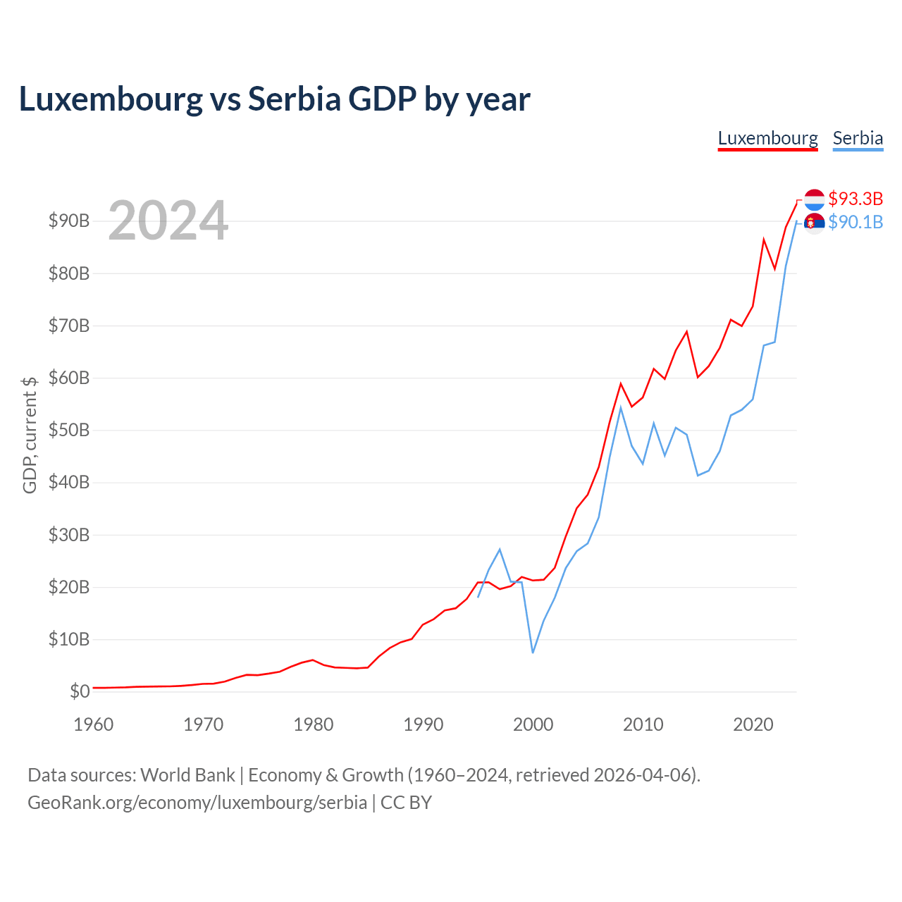 Luxembourg has a GDP of $93.3B compared to $90.1B for Serbia, ranking 74/197 and 76/197 by economy size, respectively.
