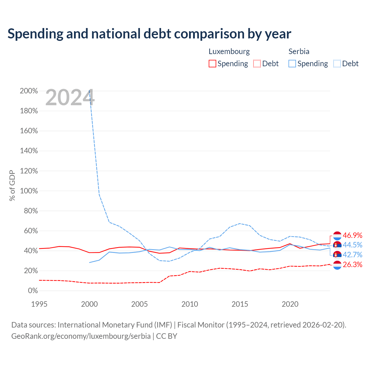 Luxembourg has $24.5B in government debt (26.3% of GDP), compared to $40.1B (44.5% of GDP) in Serbia.