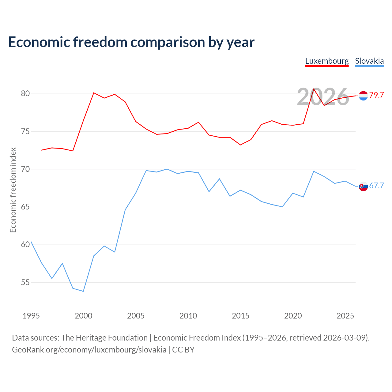 The Economic Freedom Index for Luxembourg is 79.7, ranking 7/197, compared to 67.7 for Slovakia, ranking 54/197. The chart above displays a comparison of annual changes in economic freedom indexes.