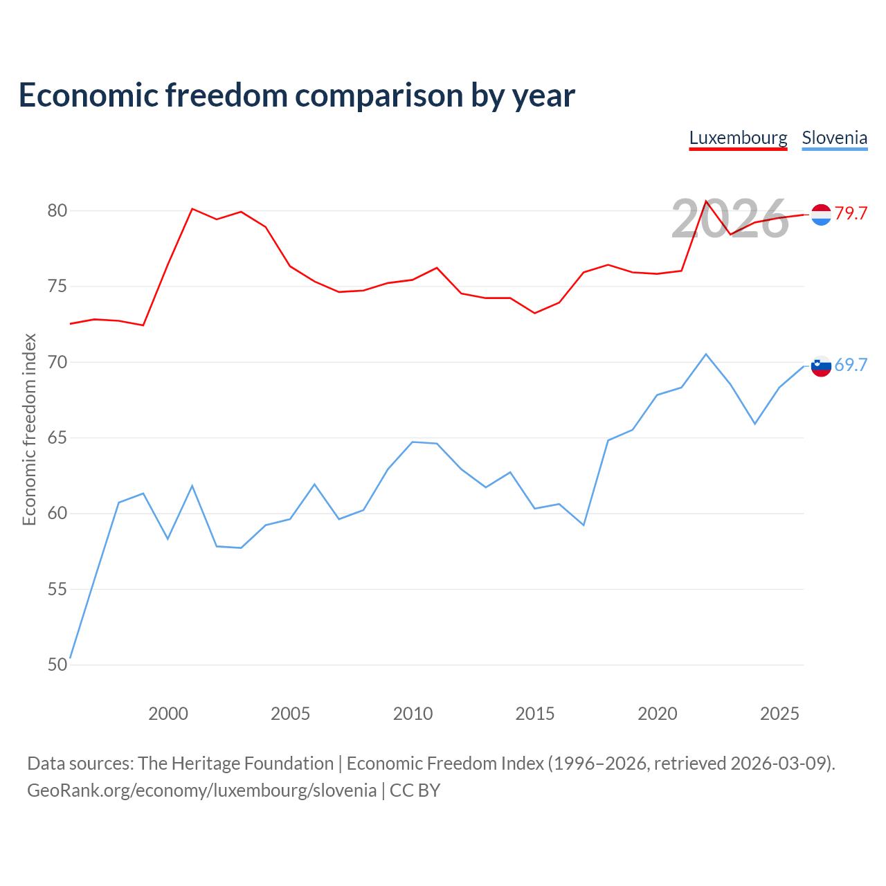 The Economic Freedom Index for Luxembourg is 79.7, ranking 7/197, compared to 69.7 for Slovenia, ranking 40/197. The chart above displays a comparison of annual changes in economic freedom indexes.