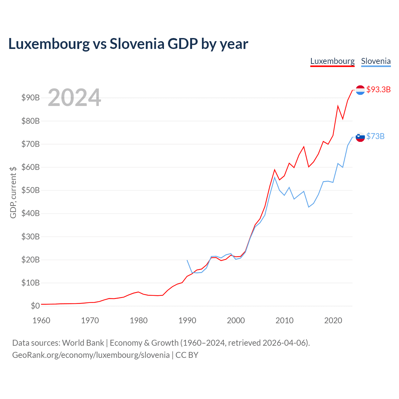 Luxembourg has a GDP of $93.3B compared to $73B for Slovenia, ranking 74/197 and 86/197 by economy size, respectively.