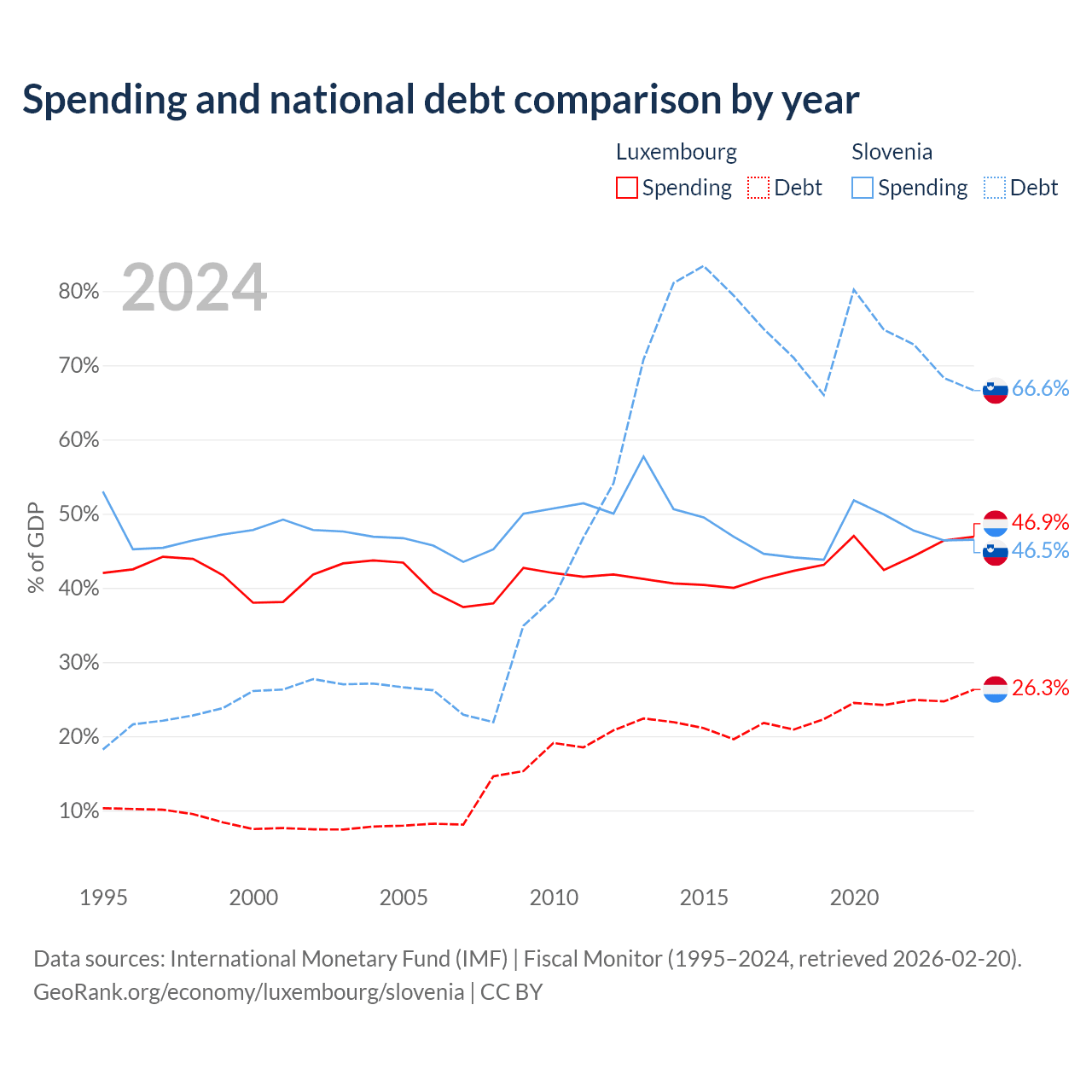Luxembourg has $24.5B in government debt (26.3% of GDP), compared to $48.6B (66.6% of GDP) in Slovenia.