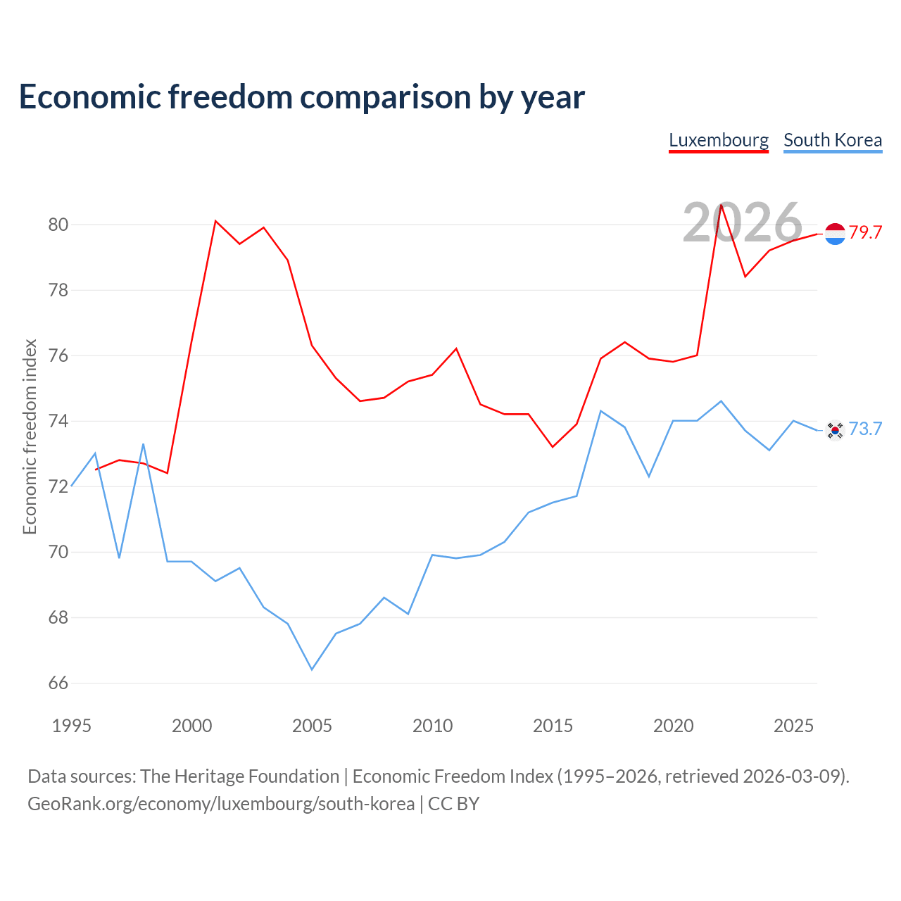 The Economic Freedom Index for Luxembourg is 79.7, ranking 7/197, compared to 73.7 for South Korea, ranking 24/197. The chart above displays a comparison of annual changes in economic freedom indexes.