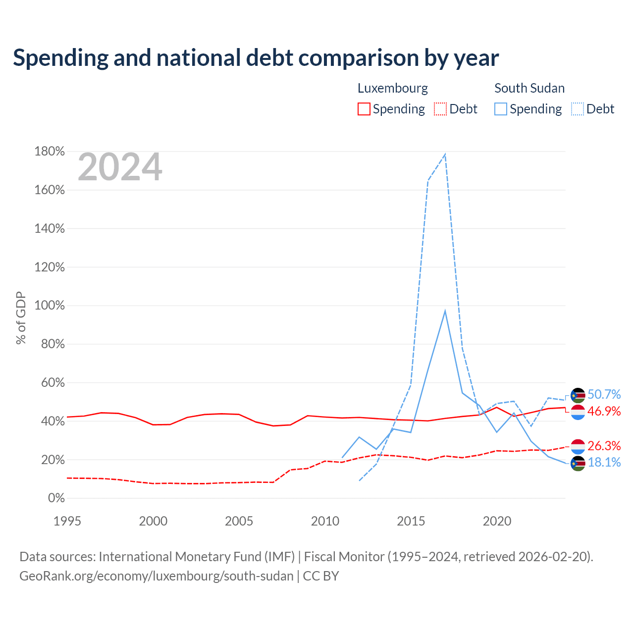 Luxembourg has $24.5B in government debt (26.3% of GDP), compared to $7.04B (50.7% of GDP) in South Sudan.