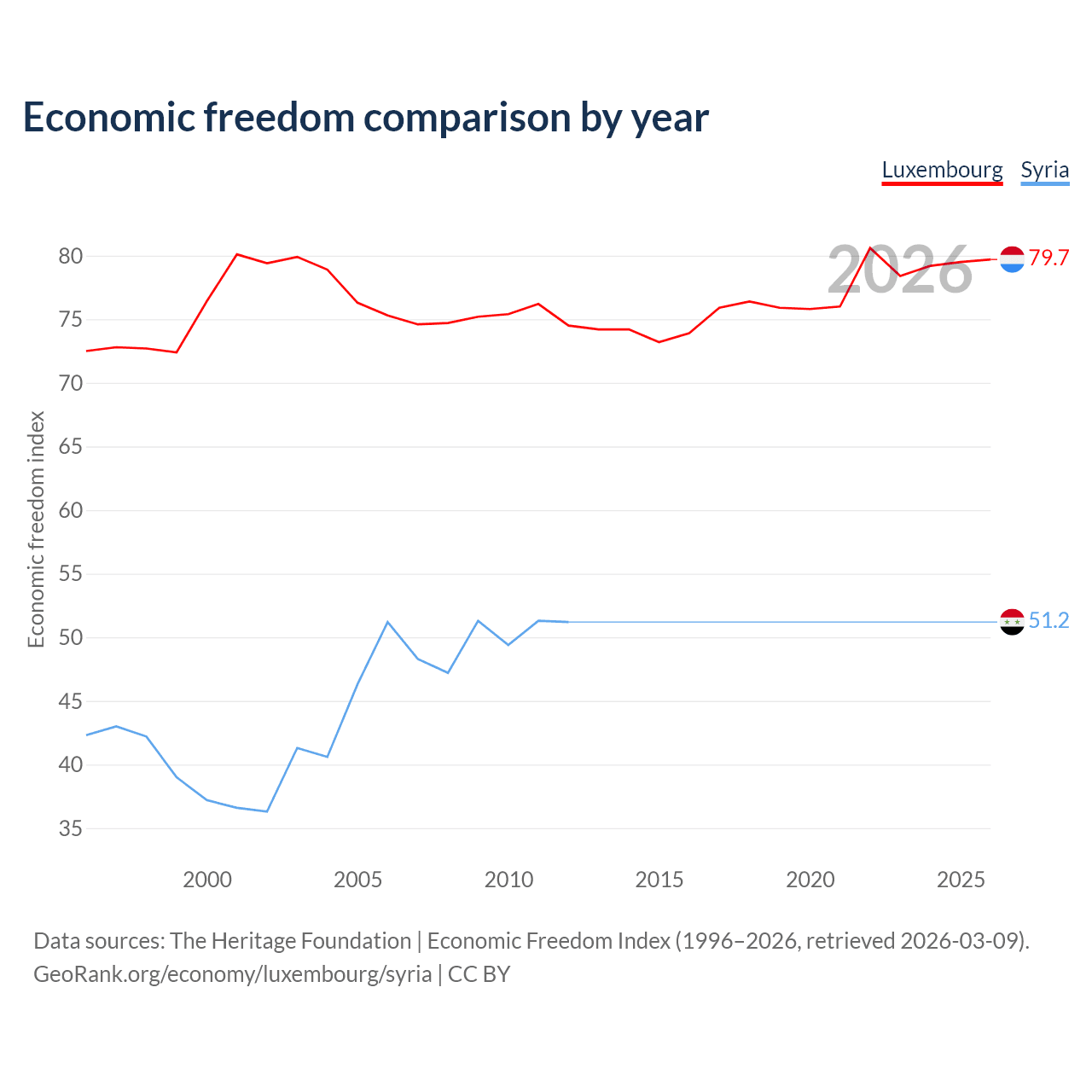 The Economic Freedom Index for Luxembourg is 79.7, ranking 7/197, compared to 51.2 for Syria, ranking 155/197. The chart above displays a comparison of annual changes in economic freedom indexes.