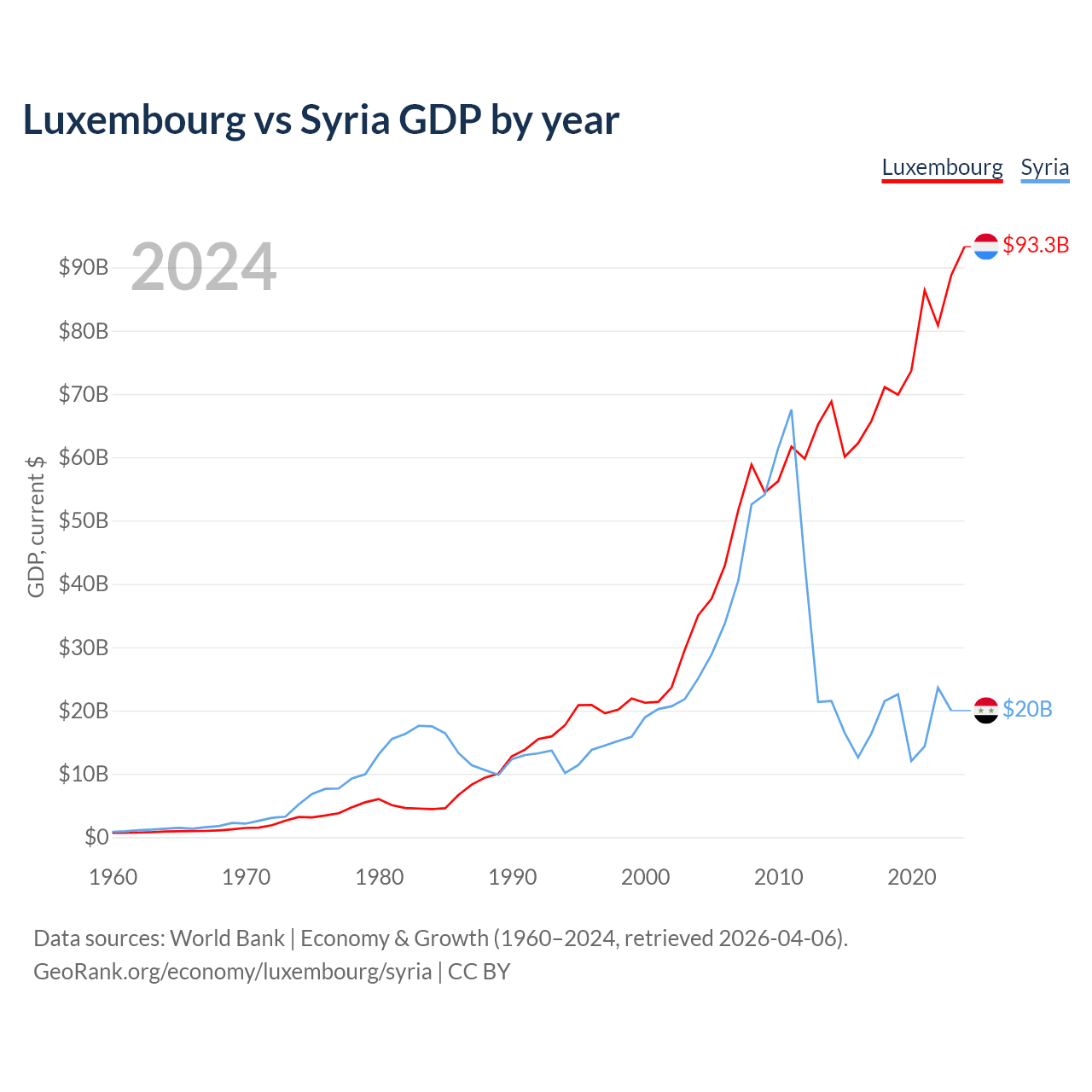 Luxembourg has a GDP of $93.3B compared to $20B for Syria, ranking 74/197 and 129/197 by economy size, respectively.