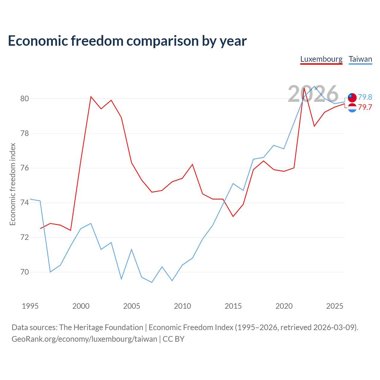 The Economic Freedom Index for Luxembourg is 79.7, ranking 7/197, compared to 79.8 for Taiwan, ranking 6/197. The chart above displays a comparison of annual changes in economic freedom indexes.