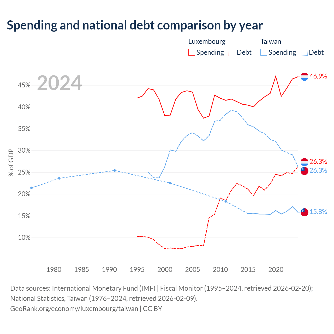 Luxembourg has $24.5B in government debt (26.3% of GDP), compared to $211B (26.3% of GDP) in Taiwan.