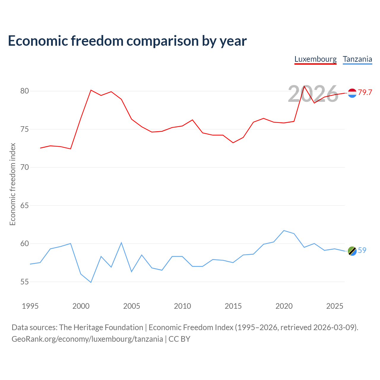 The Economic Freedom Index for Luxembourg is 79.7, ranking 7/197, compared to 59 for Tanzania, ranking 106/197. The chart above displays a comparison of annual changes in economic freedom indexes.
