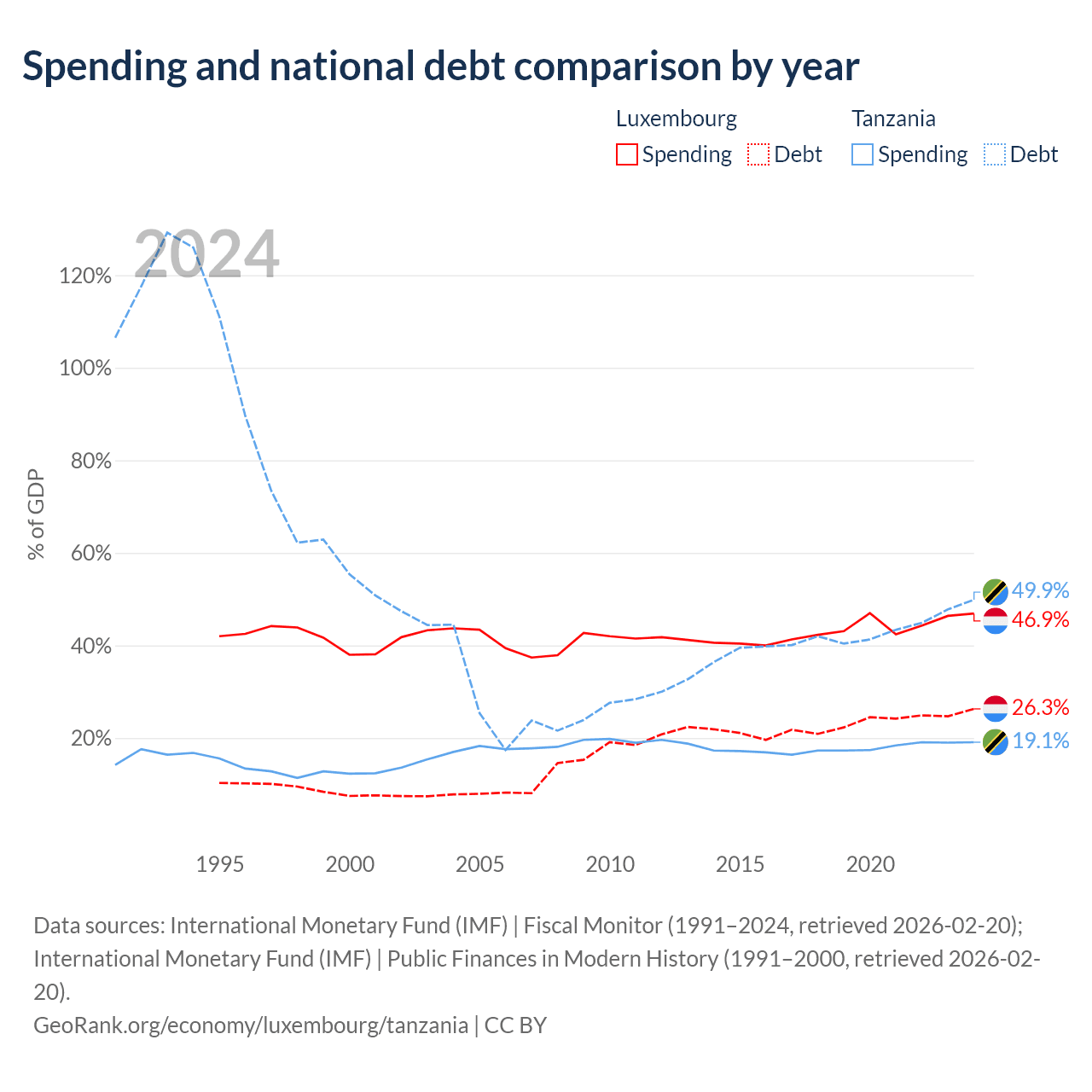 Luxembourg has $24.5B in government debt (26.3% of GDP), compared to $39.3B (49.9% of GDP) in Tanzania.