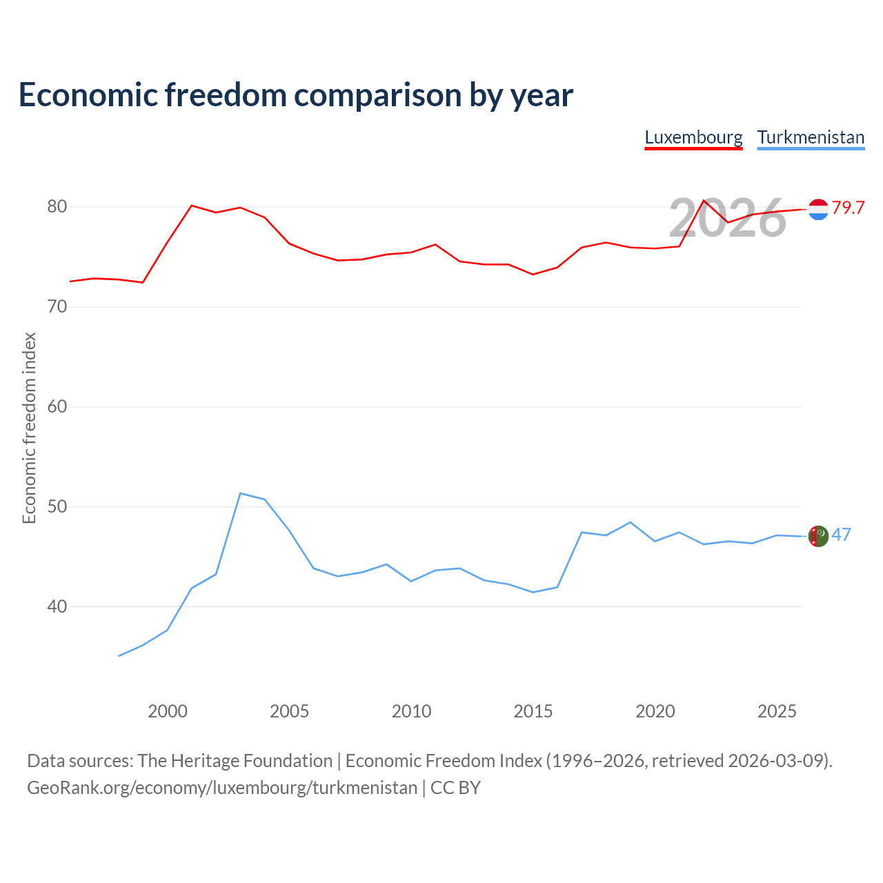 The Economic Freedom Index for Luxembourg is 79.7, ranking 7/197, compared to 47 for Turkmenistan, ranking 177/197. The chart above displays a comparison of annual changes in economic freedom indexes.