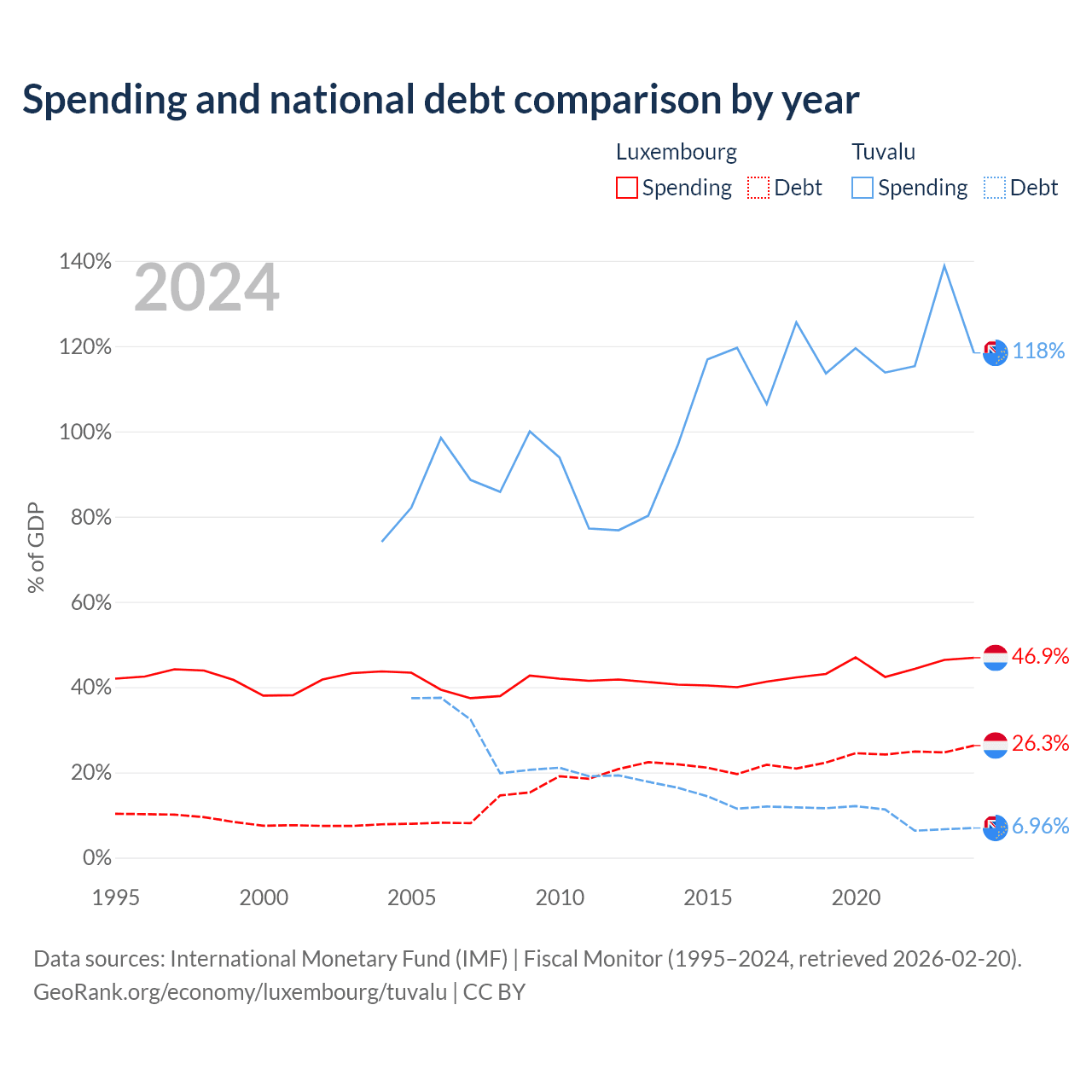 Luxembourg has $24.5B in government debt (26.3% of GDP), compared to $4.15M (6.96% of GDP) in Tuvalu.